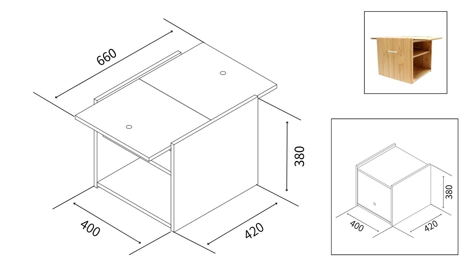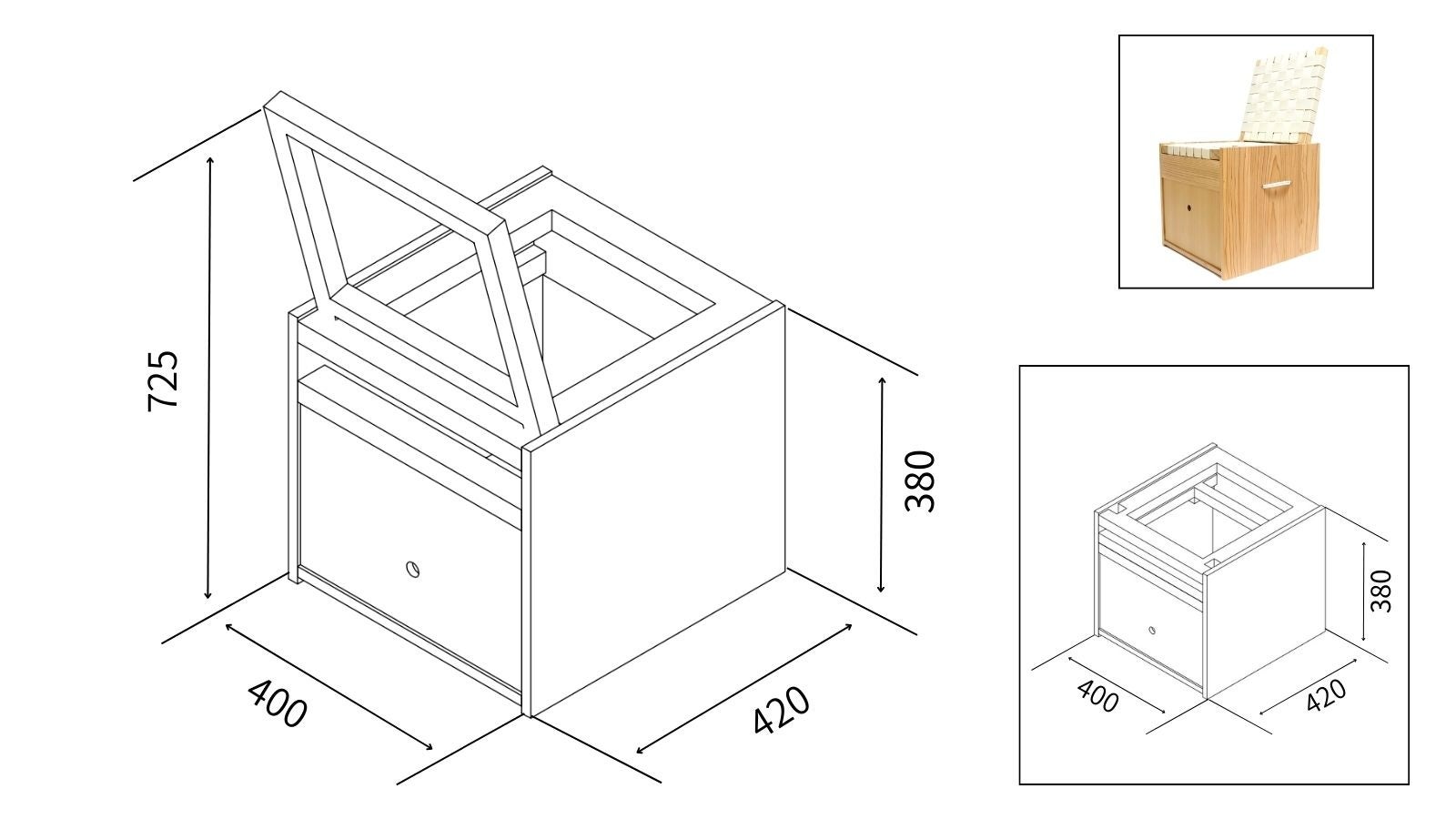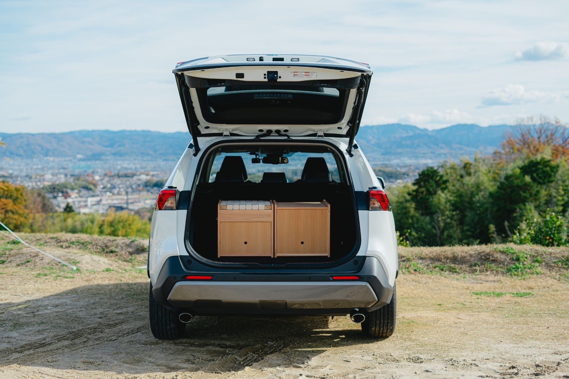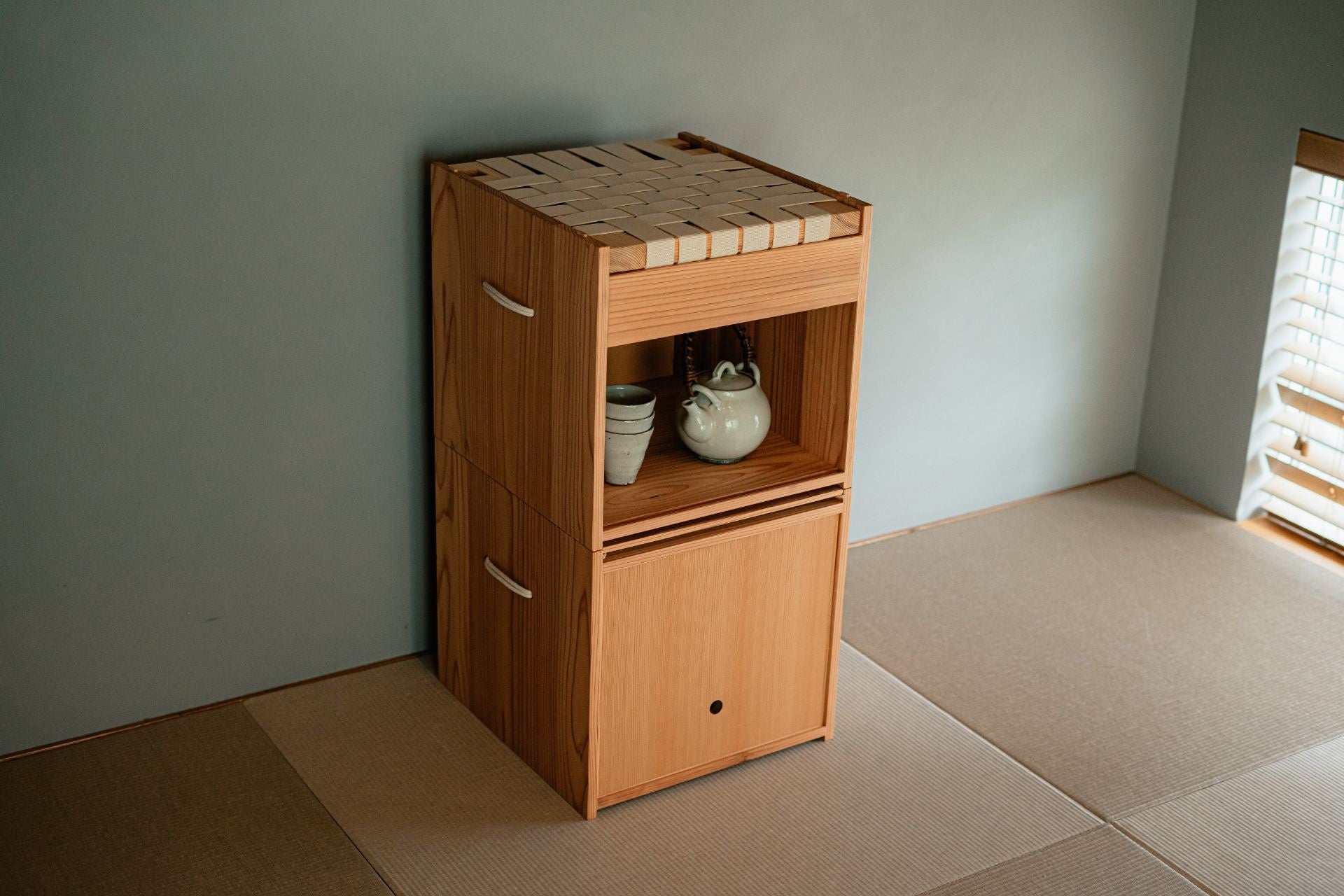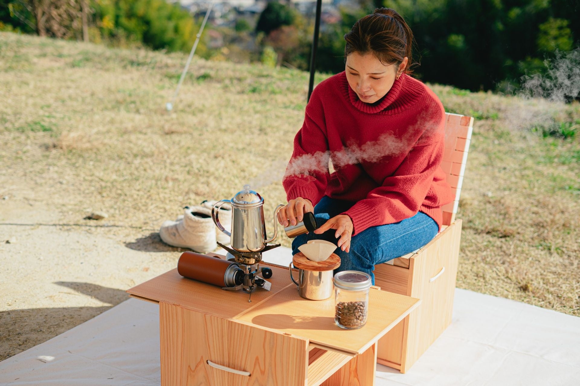 一生使える道具を基本思想に、キャンプギアと家具の両面を合わせ持つ、シェルフ(棚)・コンテナボックス・テーブルまたはチェアの3役を実現する新しいシステムを開発し、木目が美しく、軽くて丈夫な奈良県産吉野杉で製品化。
