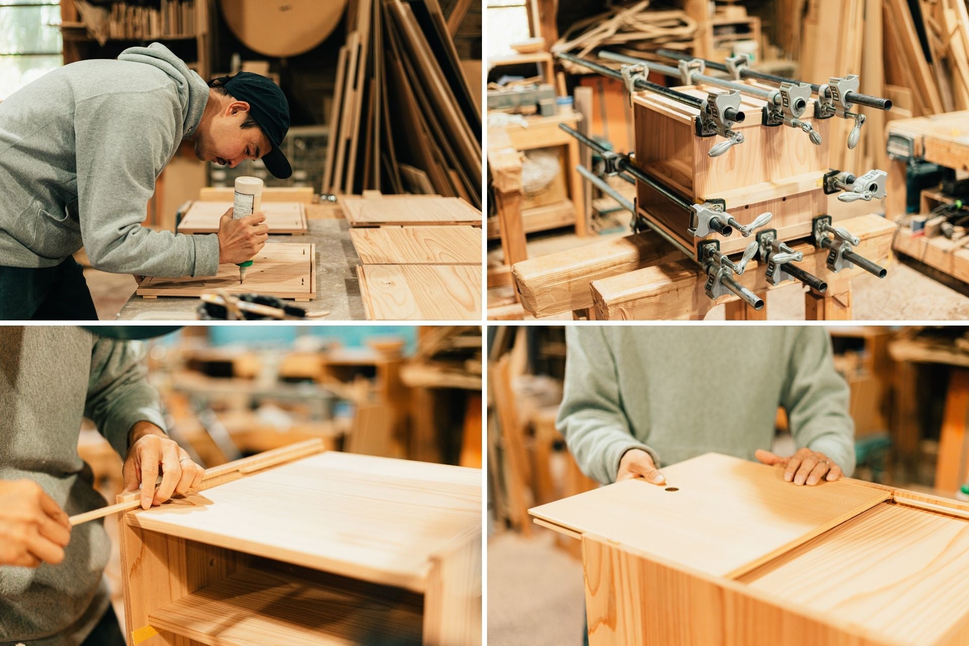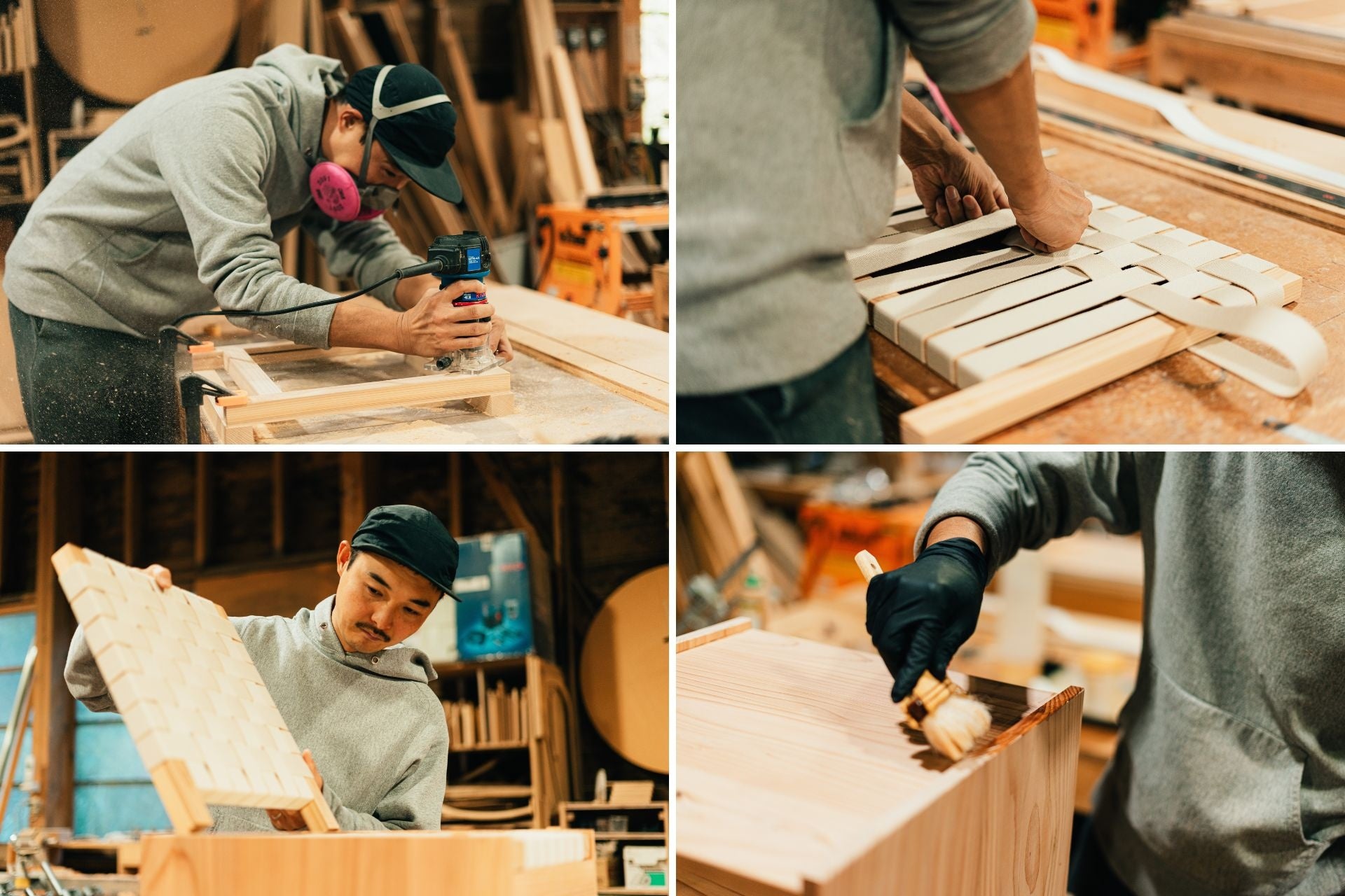 すべて洗練された家具職人によって一つ一つ丁寧に受注生産体制で作りあげられています。 大量生産に利用される巨大な機械や設備に依存せず、木材の原理を深く理解し、職人だからこそできる技によってシンプルなデザインで機能性ある製品に仕立て上げられます。その繊細な技術は手に取った瞬間、隅々に感じる事ができます。