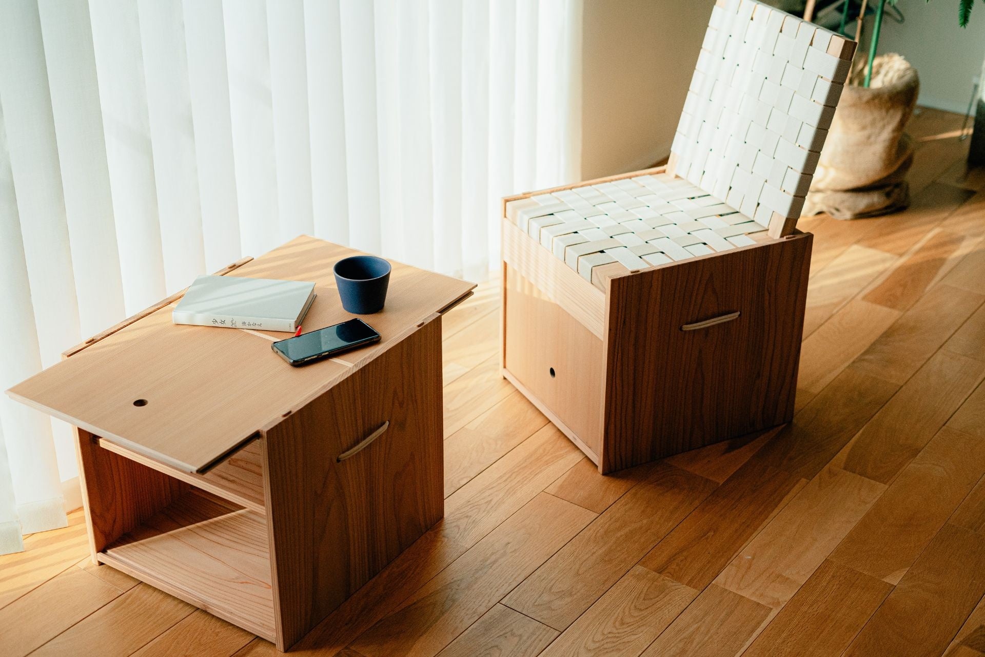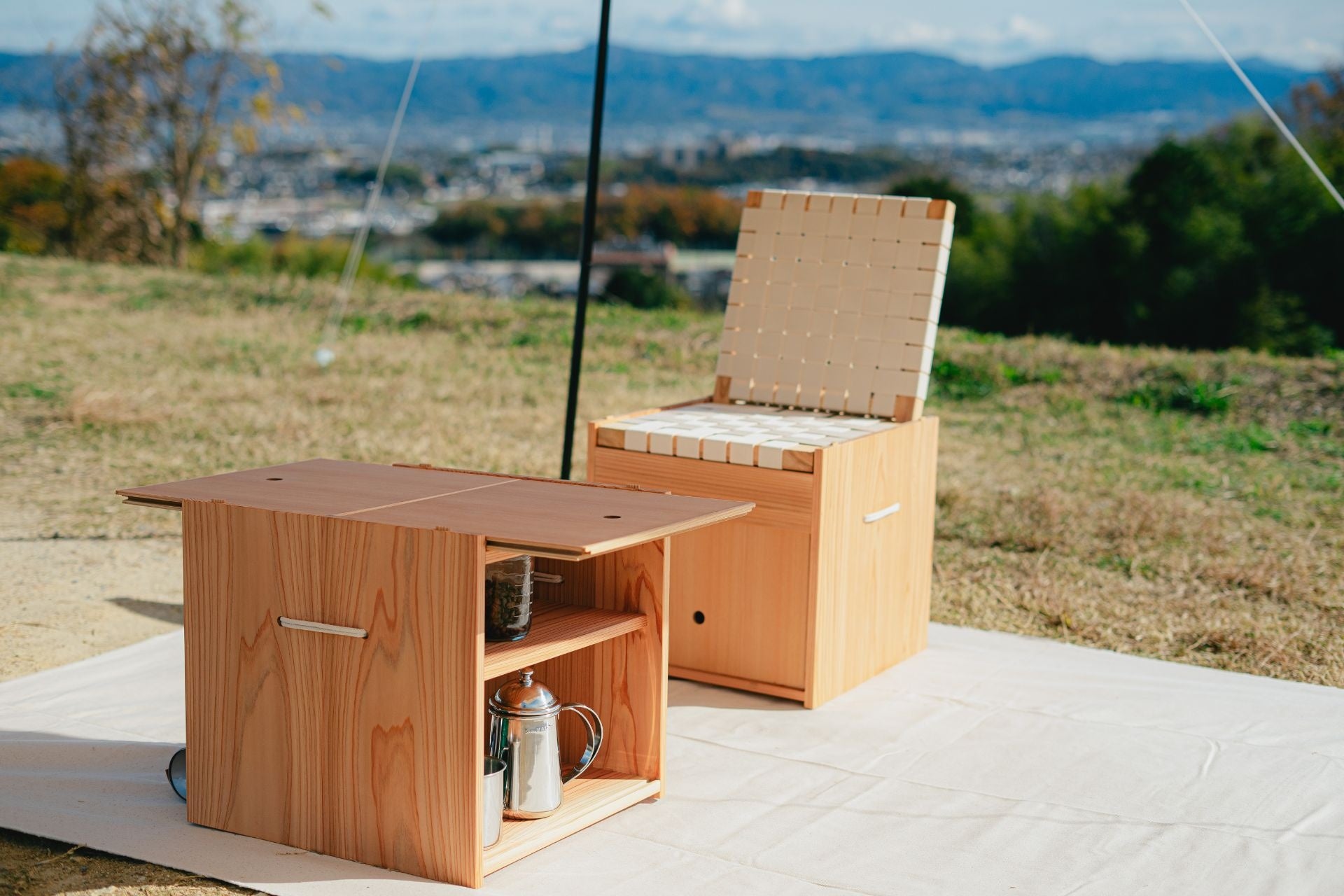 【新開発】1台3役。インドア・アウトドアの両シーンで活躍する吉野杉のシェルフコンテナテーブル・チェアを開発し先行予約販売開始!