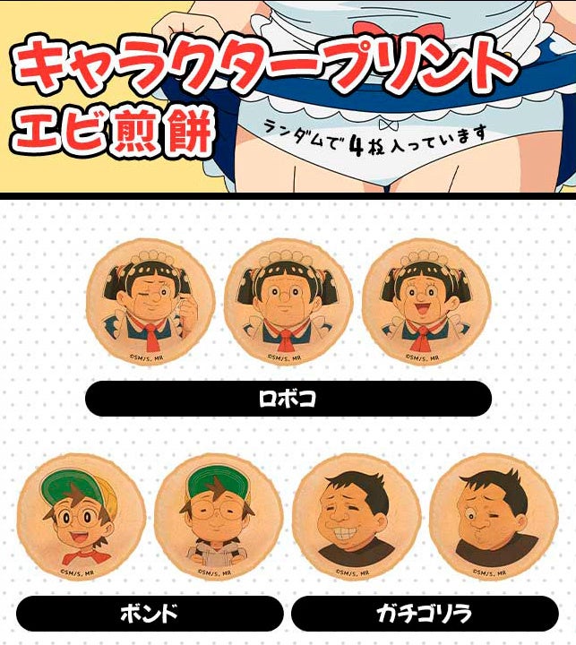 『僕とロボコのエビセン』は1箱8枚入りの海老せんべいの中に、4枚のキャラせんべいがランダムに入っています。
