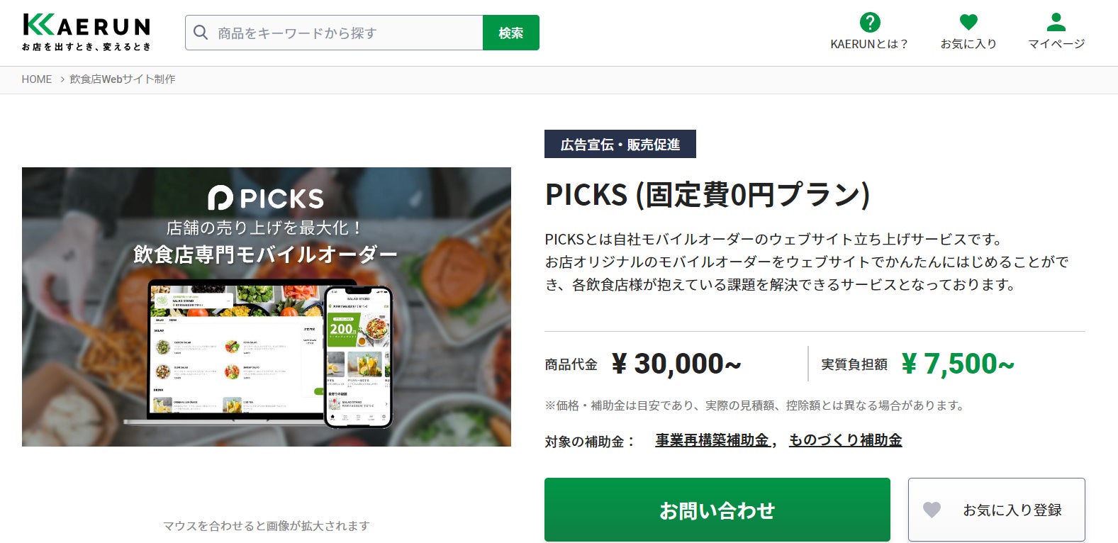 補助金マッチングプラットフォーム「KAERUN」では、飲食企業向けの商品・サービスを補助金利用時の実質負担額を確認しながら、導入をご検討いただけます。現在約180点の商品・サービスが掲載されており、最大1/4の価格で導入いただくことも可能です。