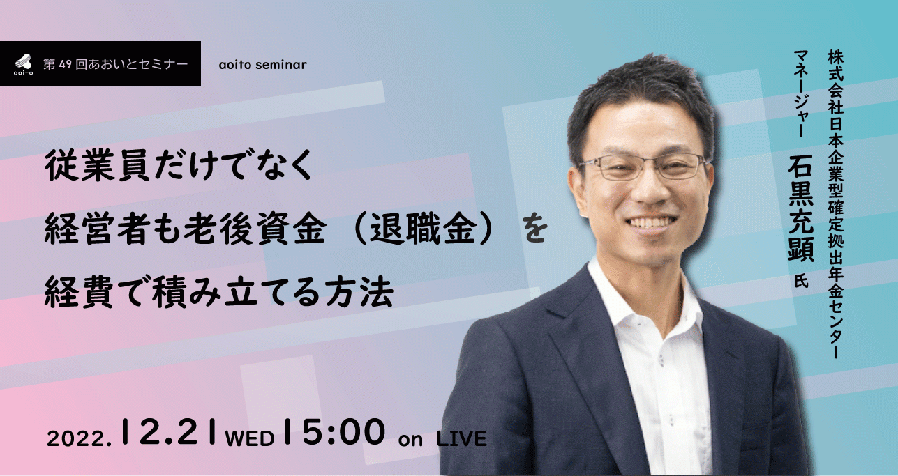 あおいと創研株式会社(本社:愛知県名古屋市中区、CEO:近藤 大補)は、2022年12月21日(水) 15時から株式会社日本企業型確定拠出年金センター石黒充顕氏を講師としてお招きし「従業員だけでなく経営者も老後資金(退職金)を経費で積み立てる方法‐企業型確定拠出年金」と題した無料の第49回あおいとオンラインセミナーを開催いたします。