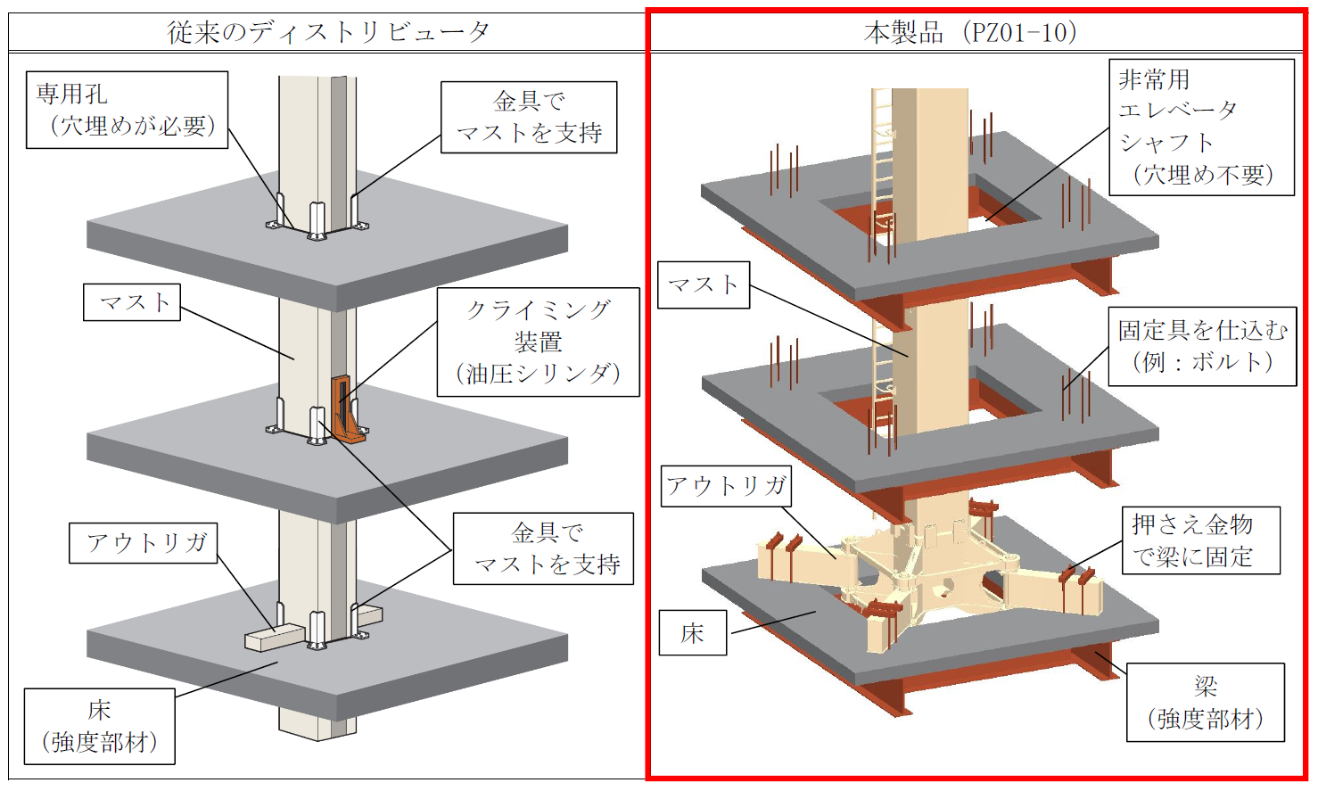 開発にあたっては、清水建設より数多くの建設現場に関するノウハウや知見を提供いただき、同社が開発した現場の非常用エレベータシャフト(エレベータ昇降路)を活用する工法により、汎用的なクレーンを用いてディストリビュータの昇降を可能としたほか、専用の設置穴および作業後の穴埋め作業が不要となりました。