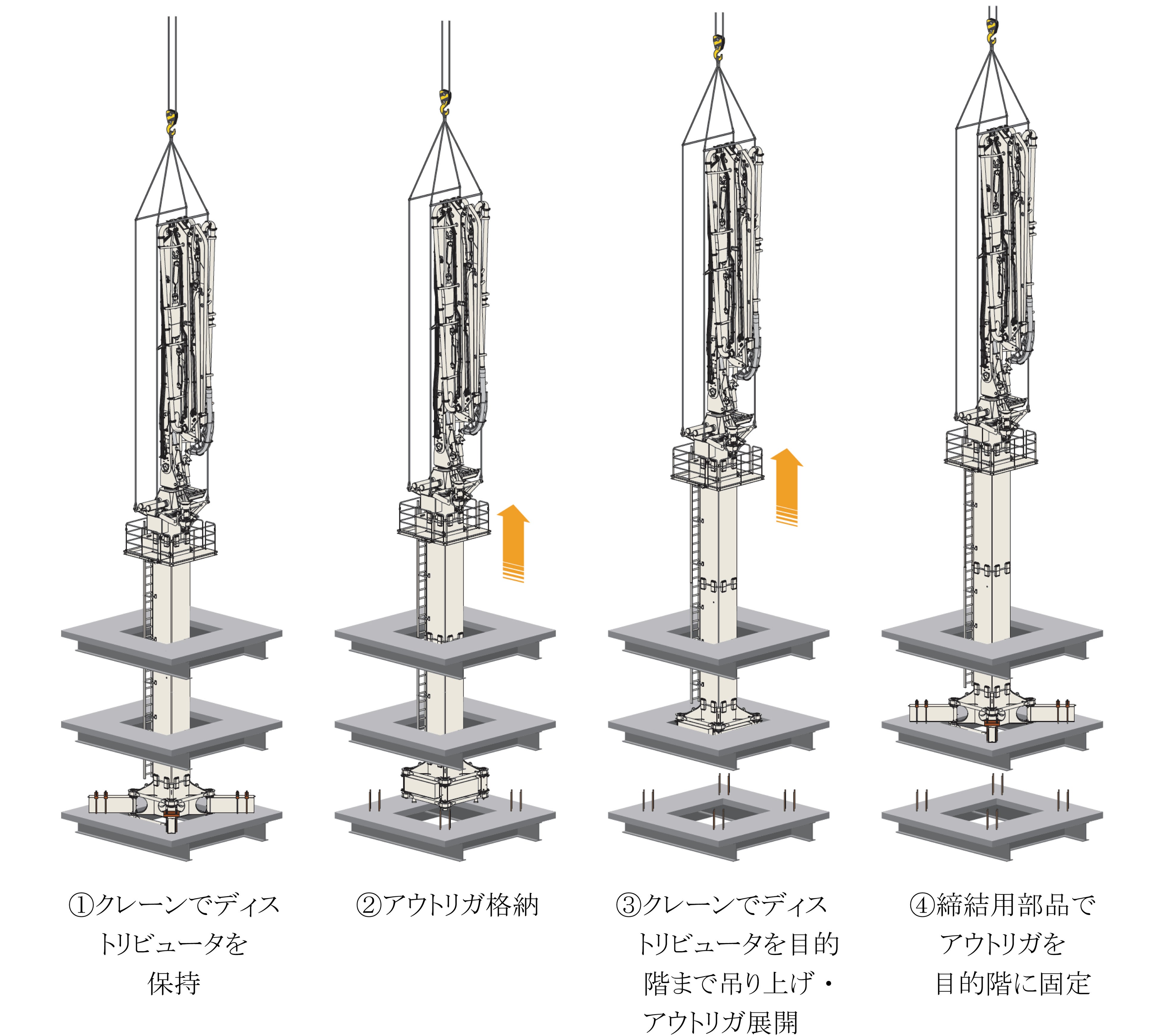 通常、ビル建設現場等の高所におけるコンクリート打設は、打設フロアの鉄筋上に配管を敷設の上、コンクリートポンプ車と接続して打設したい場所まで送り上げる工法が一般的ですが、コンクリートディストリビュータを活用することで、高所においてもコンクリートポンプ車と同様のブームワークによる幅広い範囲へのコンクリート打設が可能となりました。また、打設フロアでの配管の敷設や打設場所毎の配管の取外しが不要となり、作業工数の大幅な削減による効率化と、鉄筋への配管干渉が無くなることによる工事品質の向上を実現します。