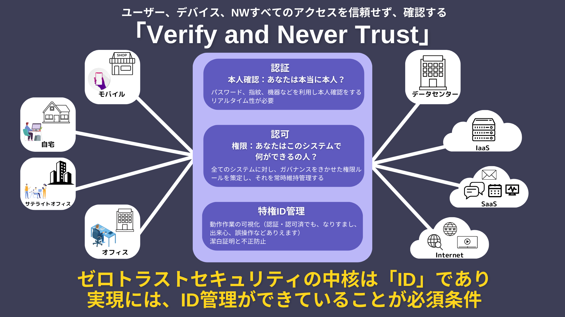 リモートワークやクラウド利用の拡大で企業におけるIT利用環境が劇的に変化する中、サイバー攻撃は複雑化、高度化し、ファイアウォールなどを設置して安全な社内ネットワーク環境を提供する従来の「境界型セキュリティ」は限界を迎えています。企業の資産を守るために、これからは、ゼロトラストセキュリティ(決して信用せず、常に検証する)の概念に基づき、その中心に位置するID管理を行うことが重要となりますが、アイ・アイ・エムはID管理の全ての領域「認証」「認可」「特権ID」でお客さまを支援します。