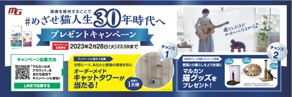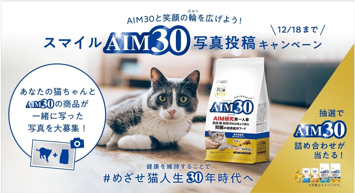 した猫の健康維持をサポートする総合栄養食「AIM30(エーアイエムサーティ)」の、 「 #めざせ猫人生30年時代へ プレゼントキャンペーン」を2023年2月28日(火)まで、「スマイルAIM30写真投稿キャンペーン」を12月18日(日)まで実施します。