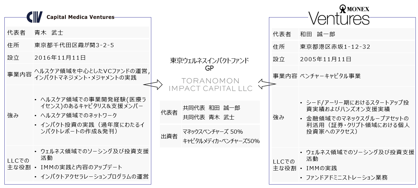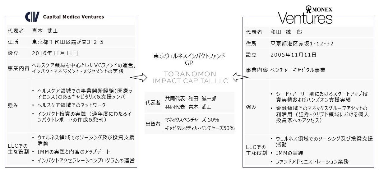 虎ノ門インパクトキャピタル合同会社はウェルネス領域においてインパクト投資を実践する株式会社キャピタルメディカ・ベンチャーズとファンド運営体制が充実しているマネックスベンチャーズ株式会社との共同運営です。