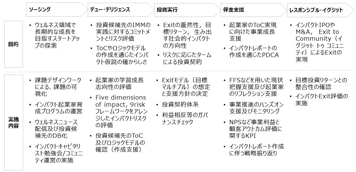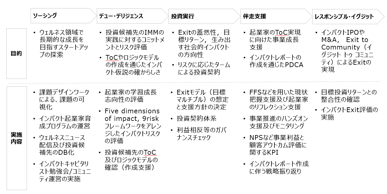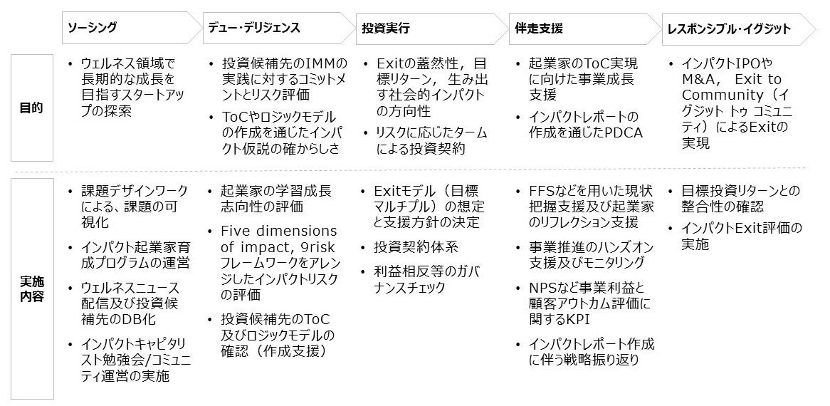 TWIFでは本質的な顧客価値を追求するスタートアップに対し、下記IMM実践プロセスを通じたハンズオン支援することで、企業価値を高め、投資リターンを最適化するインパクトIPOやExit to Community(イグジット トゥ コミュニティ)などのレスポンシブル・イグジットにつなげます。
