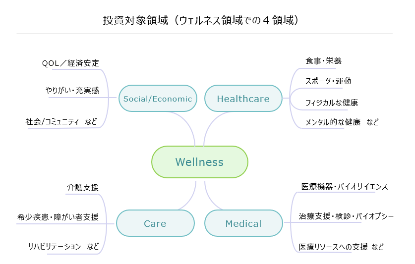 TWIFはウェルネスを投資対象領域としています。ウェルネスとは、身体的、精神的、社会的に健康で安心な状態(Global wellness Institute:GWI, 2015)であると定義されていることから、具的には、以下の4つの領域における国内の課題解決を図るスタートアップへ投資します。