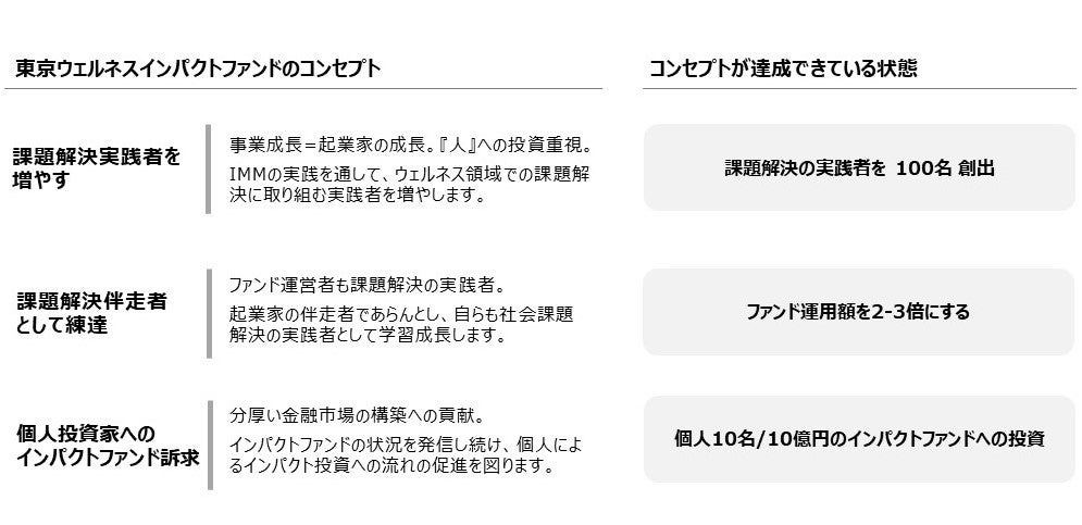 このような背景から組成されたTWIFは、スタートアップ×インパクト投資を実践することで、ウェルネス領域の課題解決をテーマに、課題解決実践者の創出とファンド利益の確保、そして個人からのインパクト投資へのお金の流れを生み出したいと考えております。