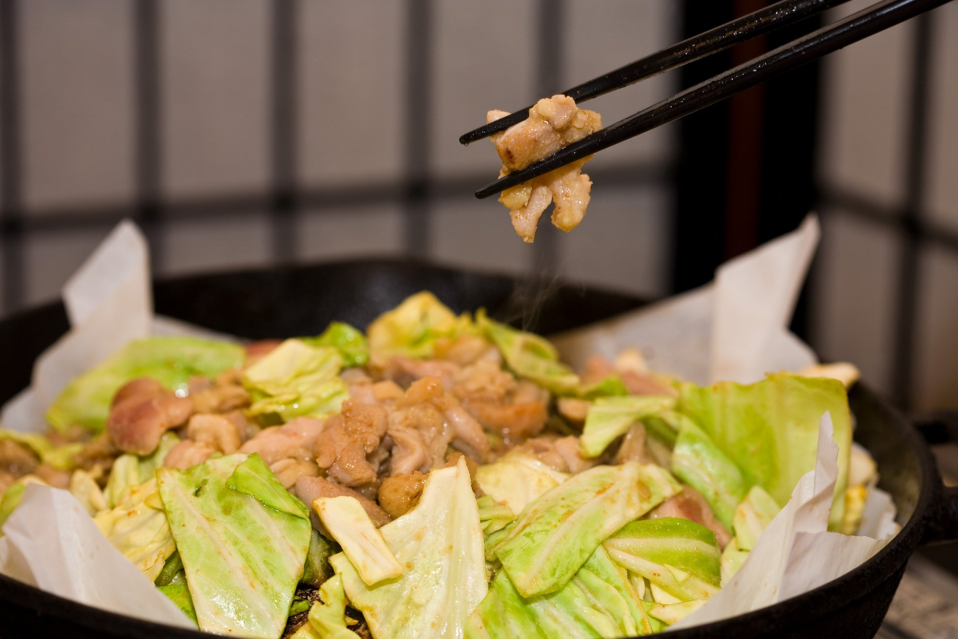 鶏肉とキャベツなどの野菜に醤油または味噌ベースの特製ダレを絡め、炒めて食べる下呂の名物「鶏ちゃん」。
