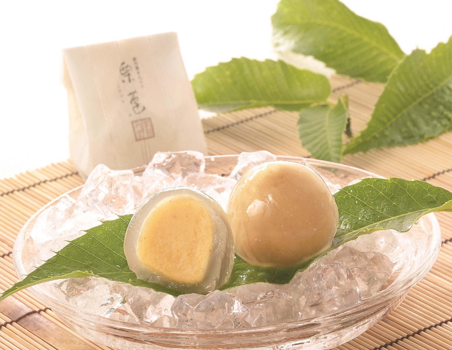 中津川の代表銘菓「栗きんとん」を葛で包み込みました。もっちりとした食感と栗本来の風味をお楽しみいただけます。冷やしていただくと一層美味しくお召し上がりいただけます。