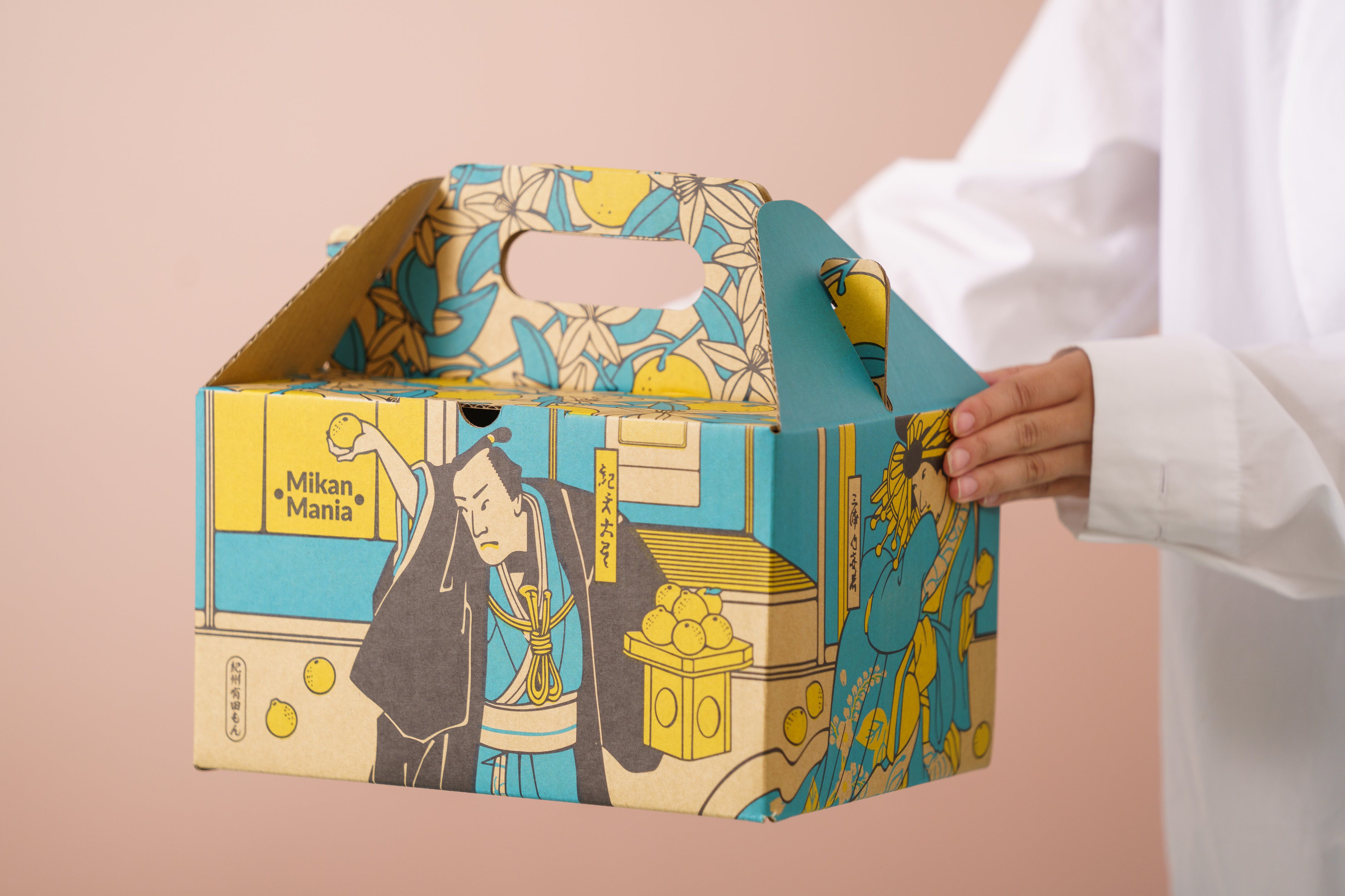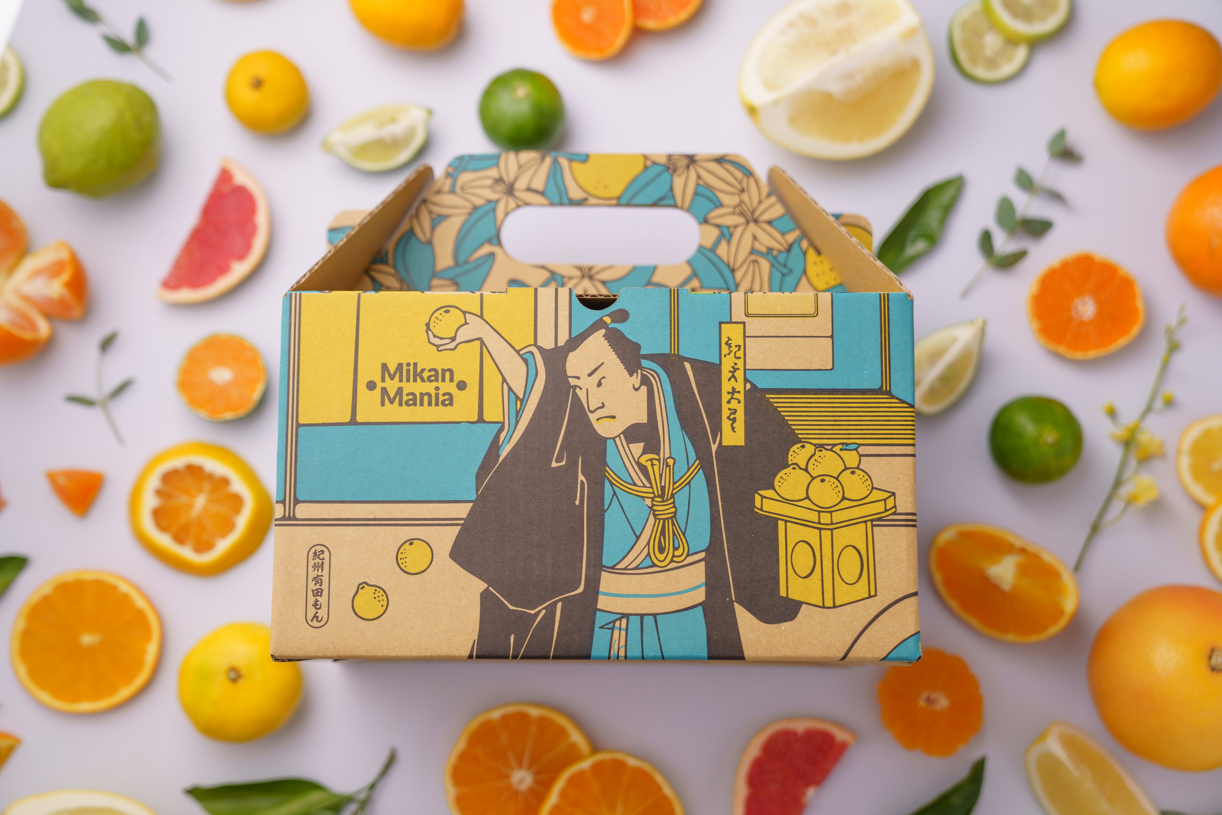 江戸時代に和歌山県有田のみかんを船で江戸や全国に運んで売って巨万の富を築いた紀伊國屋文左衛門。冬にこたつでみかんを食べる日本独特の食文化、風習もこの頃に生まれました。一方、直近の温州みかんの国内消費量は最盛期の1/5と年々減少しています。「みかんを食べる食文化、風習を次世代に継承したい」「2025年の大阪万博をきっかけに、和歌山県有田の柑橘の美味しさを世界中に伝えたい」そんな想いで彼の浮世絵をモチーフにパッケージデザインを制作しました。