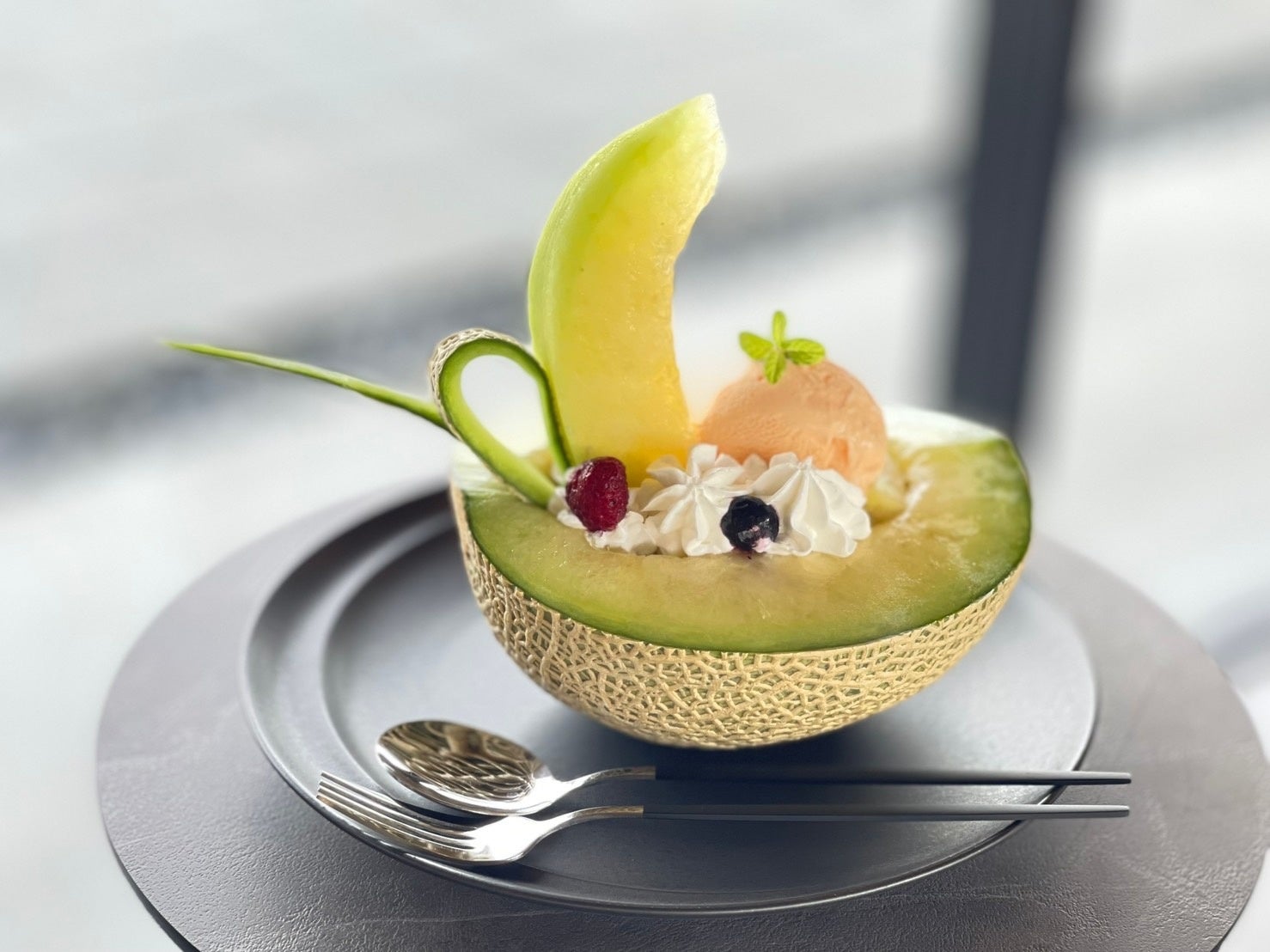 tama海terrasse創業以来の人気メニューです。今の時期は1本のつるから1個しか取れないアールスメロンを使用しています。