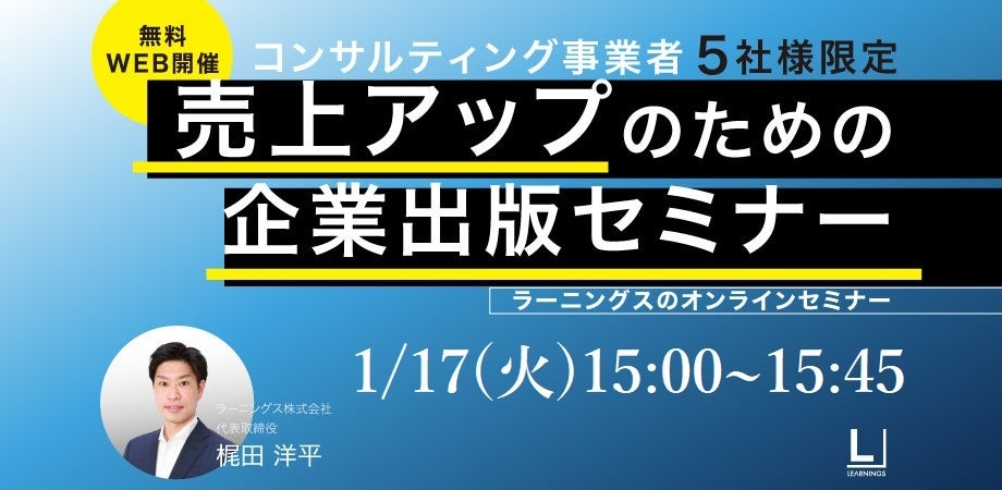 ラーニングス株式会社(本社:東京都渋谷区 代表取締役:梶田洋平 以下「ラーニングス」)は、1月17日(火)に【コンサルティング事業者5社様限定】売上アップのための企業出版セミナーをオンラインで開催します。