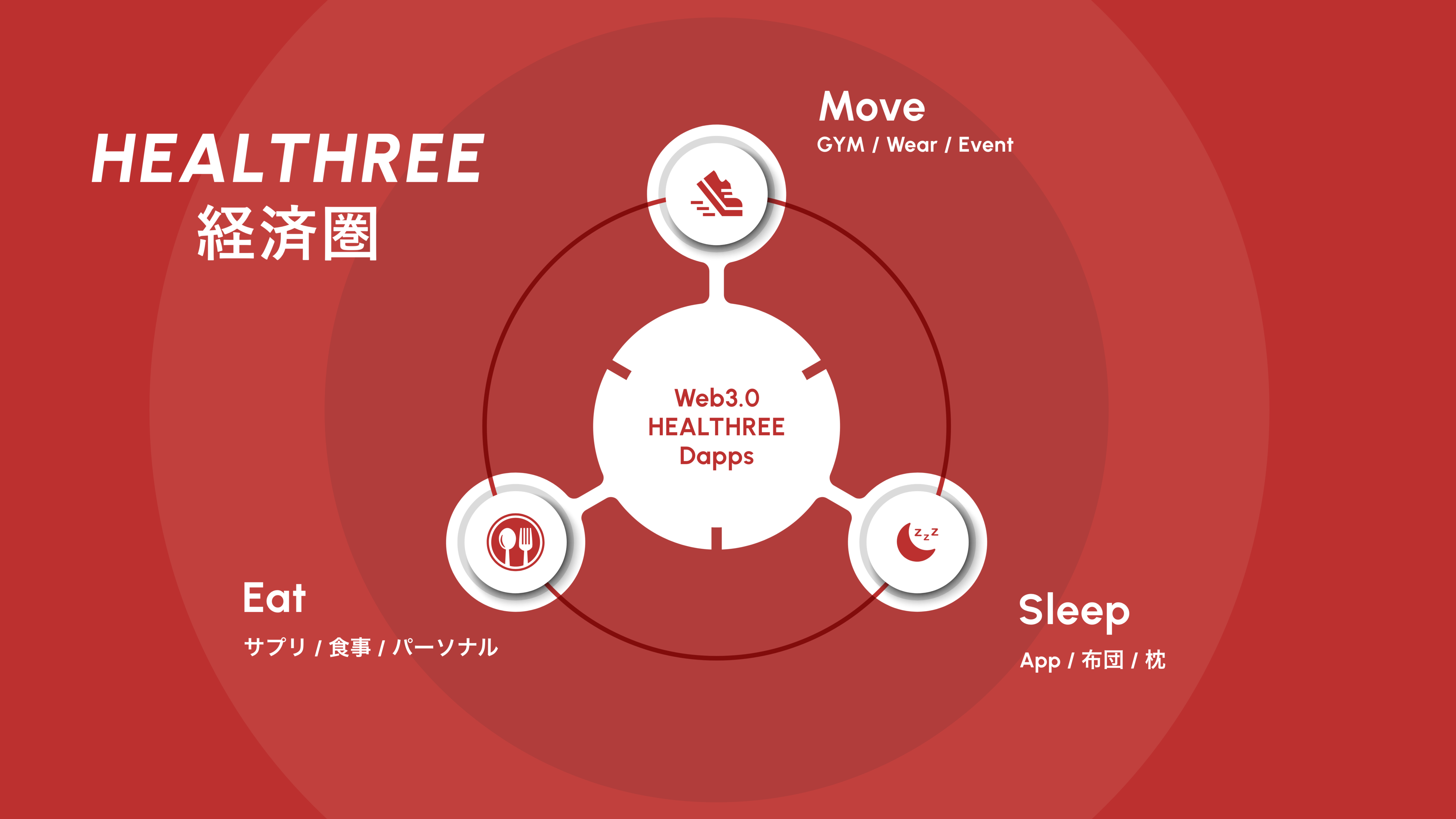 ヘルスケアブロックチェーンゲーム「HEALTHREE」を通じて、運動・睡眠・食事の3つの習慣化にアプローチすることで人の健康に貢献します。