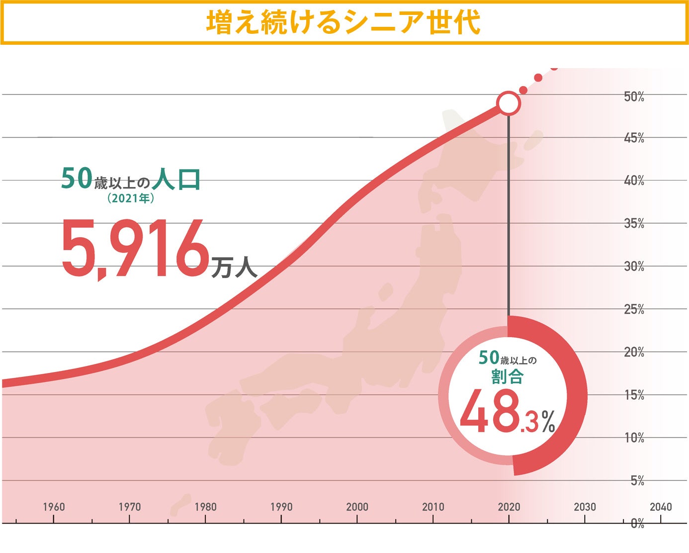 現在、65歳以上の高齢者は3,600万人を超え、日本の人口の約30%を占めています。50代以上になると、その数は5,900万人を超え、日本の人口の約50%を占めることになります。これだけ人口がいる世代にターゲットを絞るのは必然と言えるでしょう。