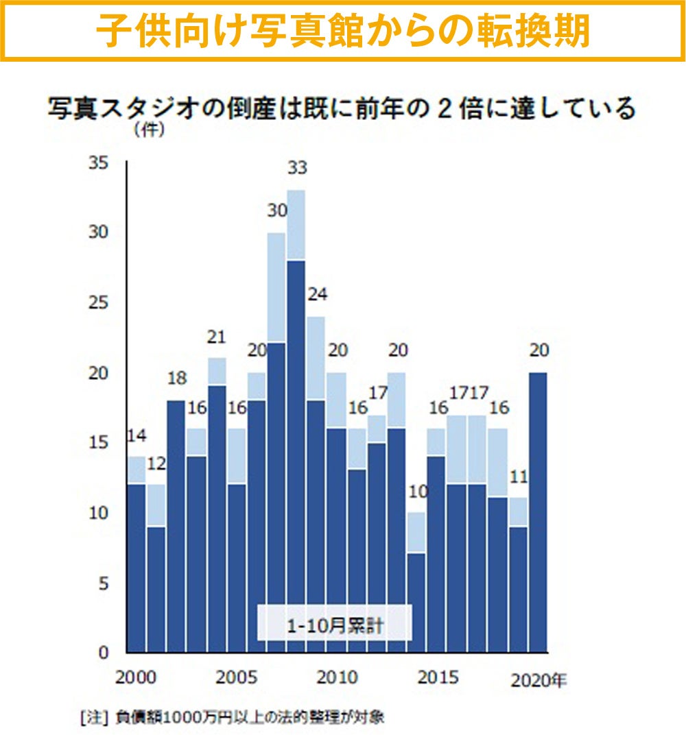 写真館のほとんどが子供をターゲットにしています。しかし、近年では少子化や新型コロナの影響で倒産件数が増加しています。写真館は今、そのビジネスモデルの転換期に迫られています。