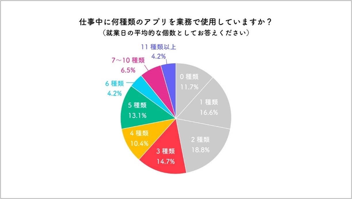 仕事中に何種類のアプリを使用しているか聞いたところ、3種類以上と答えた人が5割以上となり、なかには11種類以上のアプリやソフトを使っていると回答した人もいました。現状では、多くの人が複数のアプリやソフトを使わざる得ない状況のようです。(国内調査:n=771)
