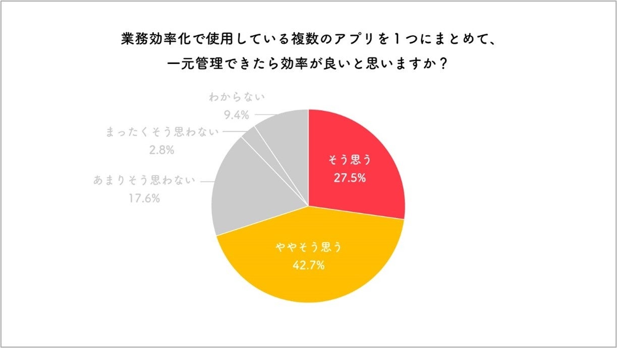 業務で使用している複数のアプリを、1つにまとめて一元管理できたら効率が良いと思いますかと尋ねたところ「そう思う」が27.5%、「やや思う」が42.7%となり、7割以上の人が業務アプリを1つにまとめて欲しいと感じていることがわかりました。(国内調査:n=681)