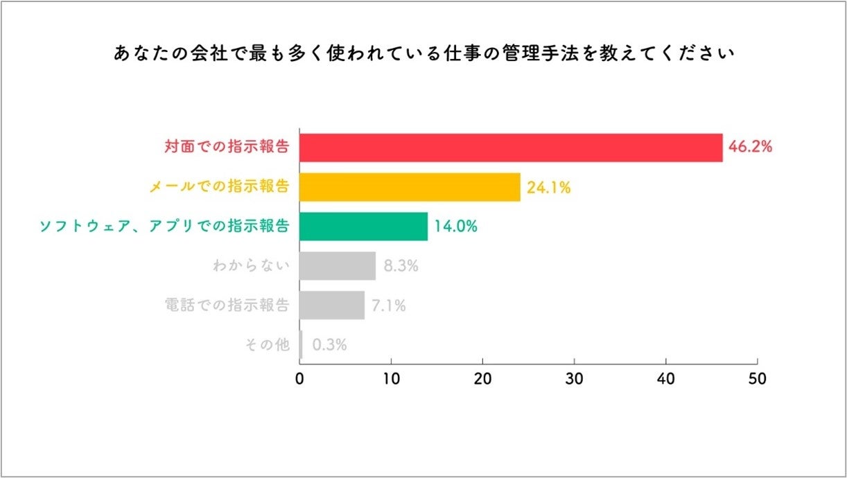 仕事の管理手法として「対面での指示報告」が46.2%、「メールでの指示報告」が24.1%という結果になりました。一方で「ソフトウェア、アプリでの指示報告」は14.0%にとどまり、まだまだ仕事の業務効率化が進んでいない現状があるようです。(国内調査:n=771)