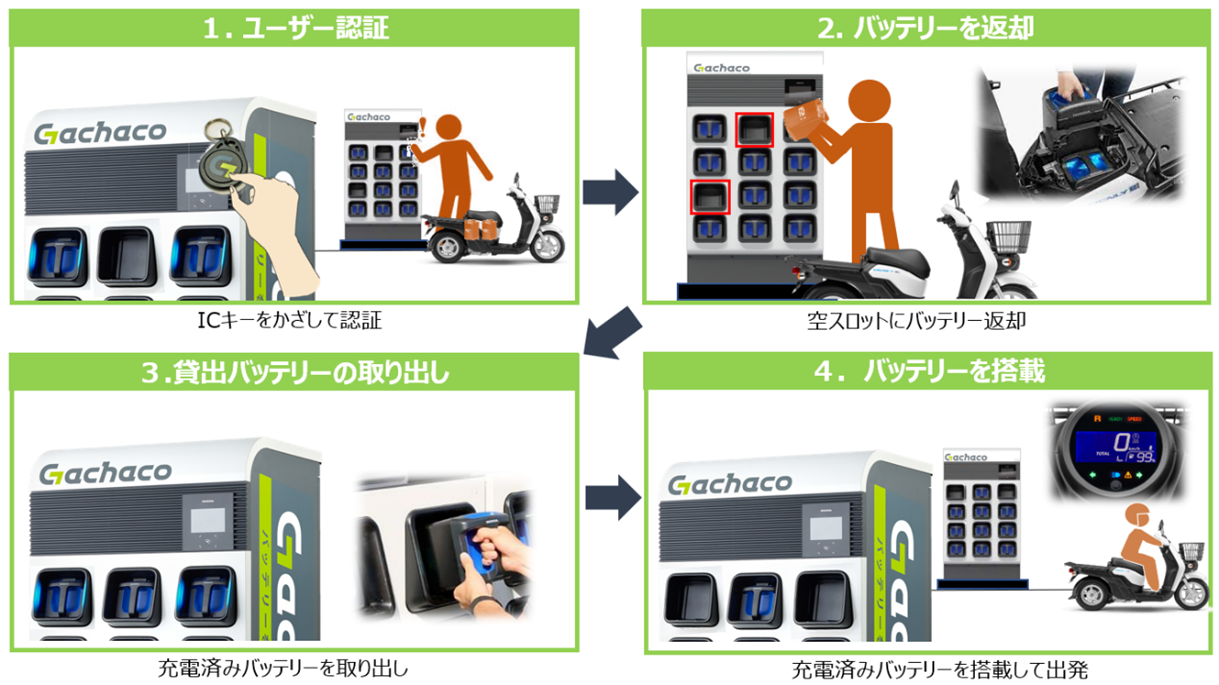 ユーザーはGachacoステーションにICキーをかざすだけで、セルフサービスでスピーディーにバッテリーを交換できます。