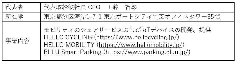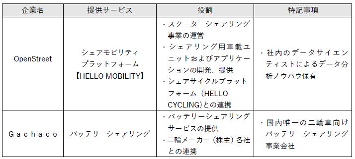 役割:スクーターシェアリング事業の運営、シェアリング用車載ユニットおよびアプリケーションの開発、提供、シェアサイクルプラットフォーム(HELLO CYCLING)との連携