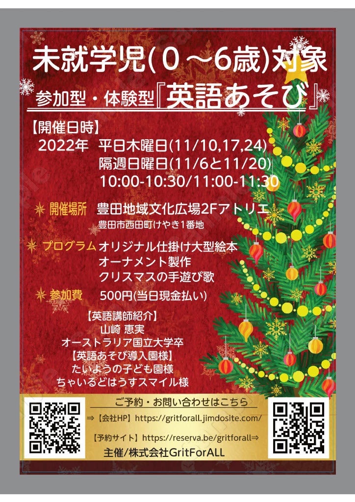 2022年10月4日に設立したばかりの会社GritForALL(グリットフォーオール:すべての人にやり抜く力を!)をより多くの方に知っていただくために、子ども達のもっと知りたい、次は何がおこるんだろうといったワクワクを大切にした参加型・体験型の楽しい『英語あそび』の時間を提供して参ります。10月から豊田市地域文化広場にてふらっと立ち寄れるワンコイン500円で参加できる『英語あそび』を始めました。11月は少し早いですがテーマはクリスマスで『英語あそび』を開催します。0~6歳児のお子様をお持ちの方、どなたでもご参加いただけます。