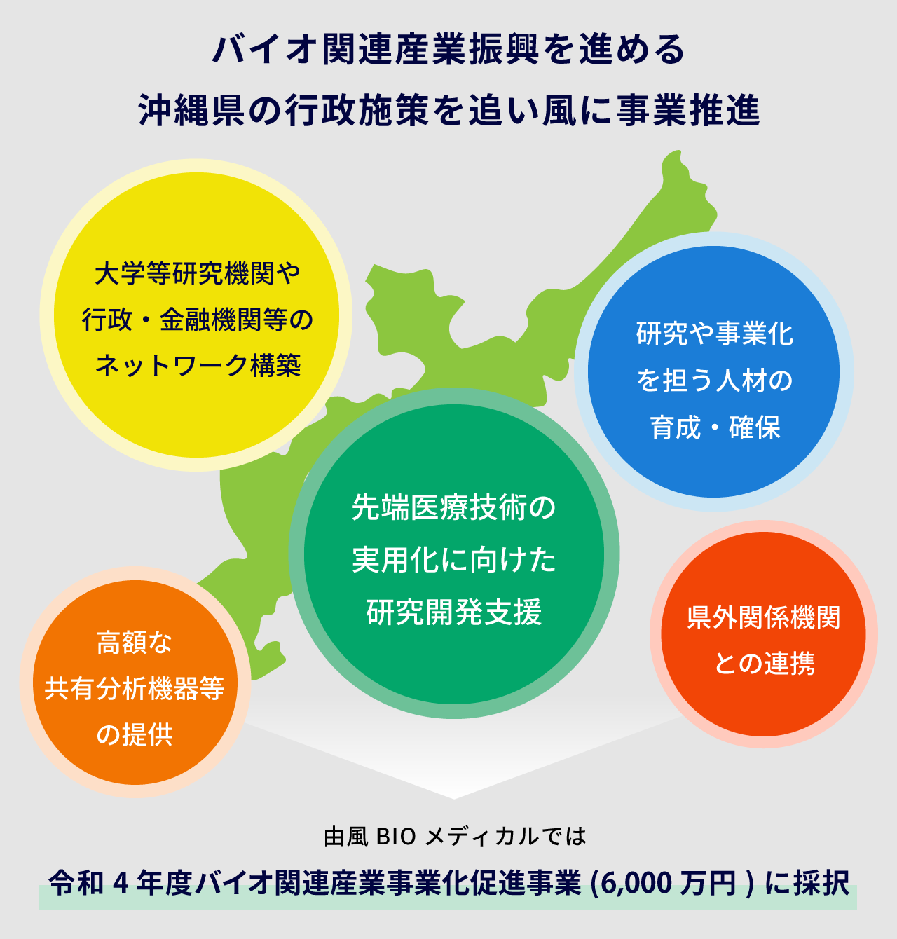 産業振興施策としてバイオ・医療領域に注力する沖縄県において、令和4年度のバイオ関連産業事業化促進事業に採択されており、行政施策も活用しながら再生医療の産業化を推進していきます。