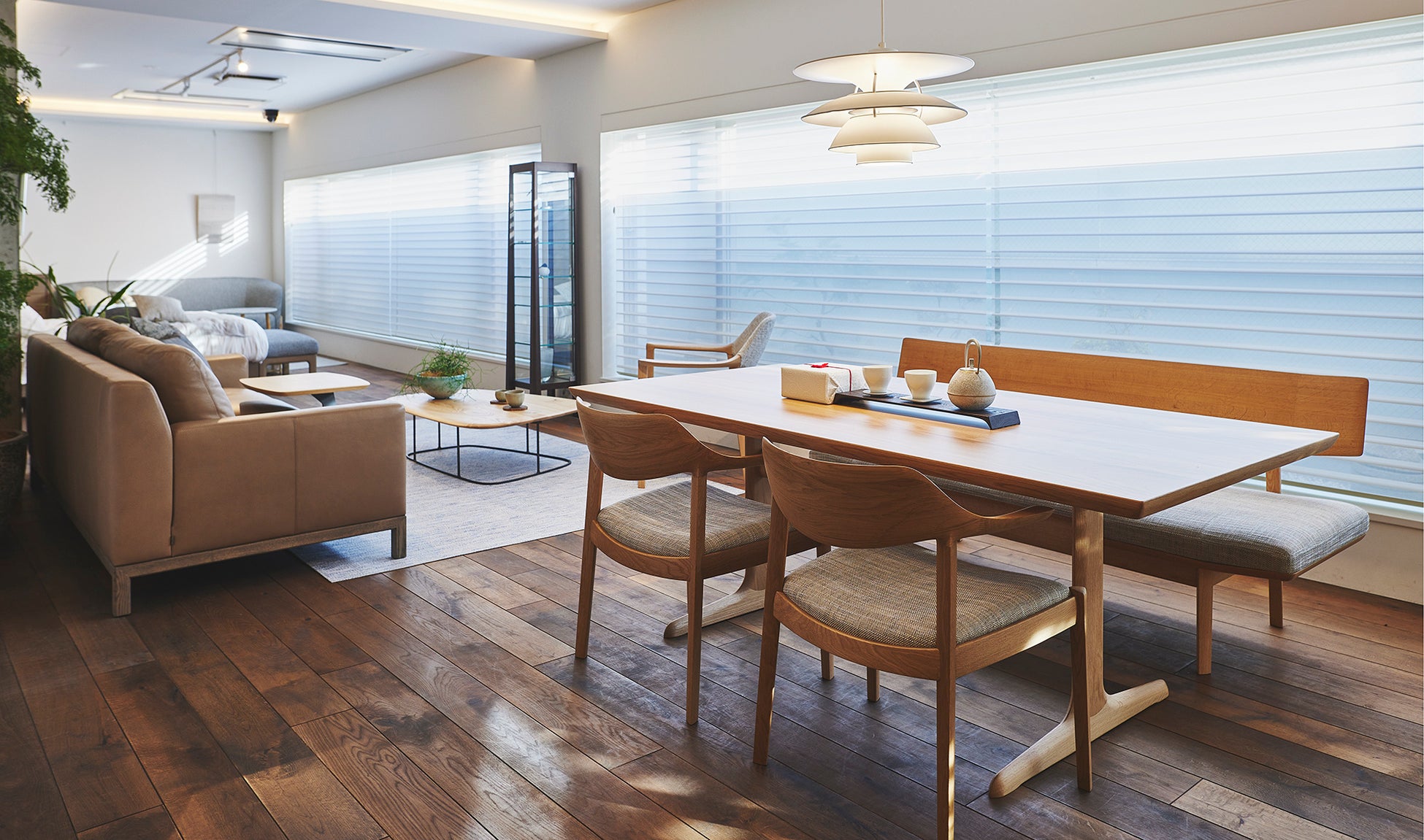 南青山に位置する東京ショップでは、1・2階合わせて500平米に、オリジナル製品約200点をディスプレイ。木質感豊かな店内に、常時14~15のリビングやダイニング、ベッドルームのシーンを設け、照明やグリーン、アートにもこだわった、心地よいライフスタイルをご提案しています。