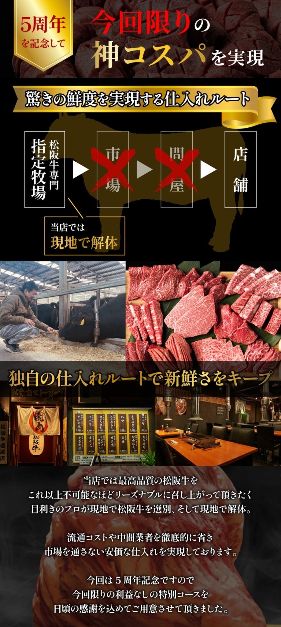 【5周年記念】 業界の常識を覆す神コスパ! 松阪牛食べ飲み放題が期間限定で復活! 今回限りの松阪牛食べ放題プラン3コースがMakuakeにて新登場!