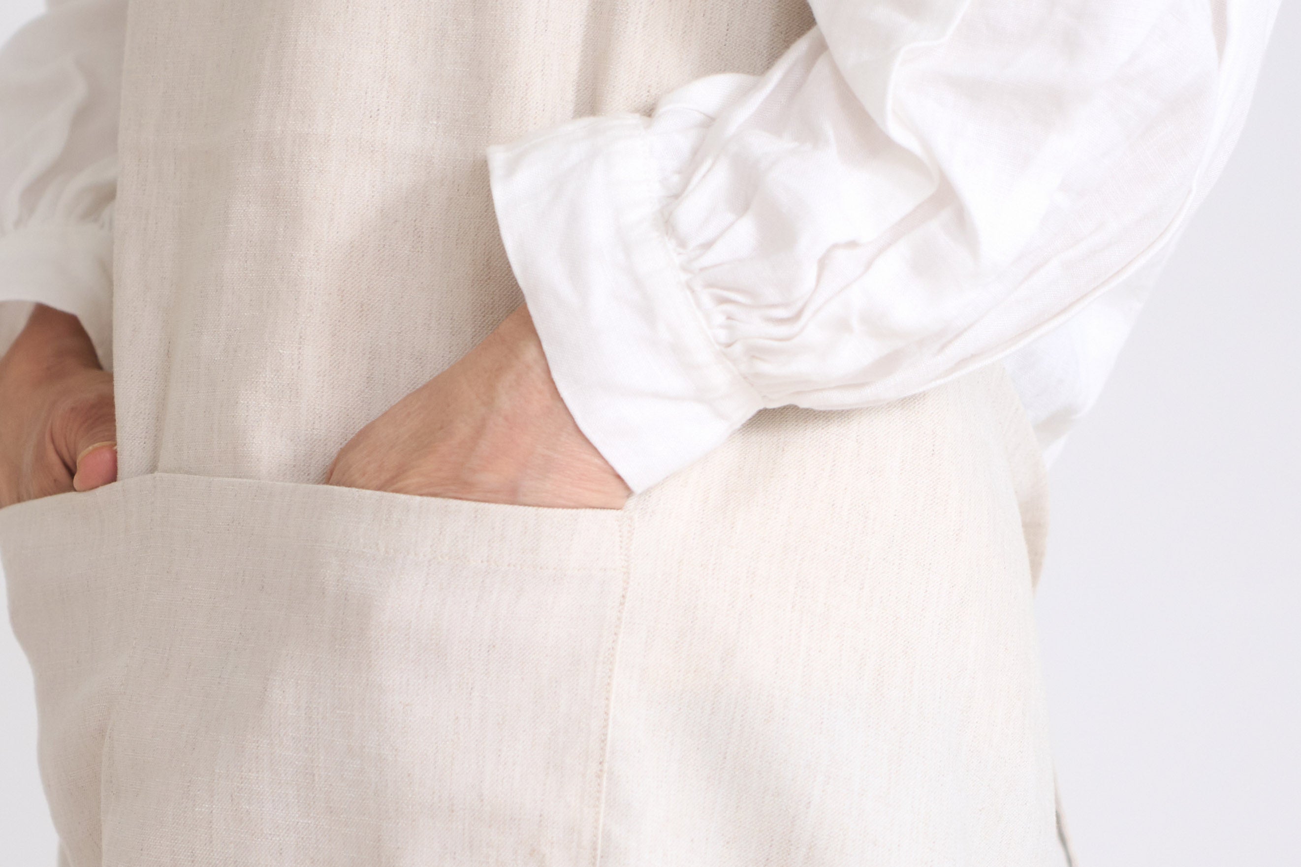 リネンポリエステル素材のため、リネンの洗いざらし感がありながらも洗っても皺になりにくい。普段使いがしやすい素材選定となっている
