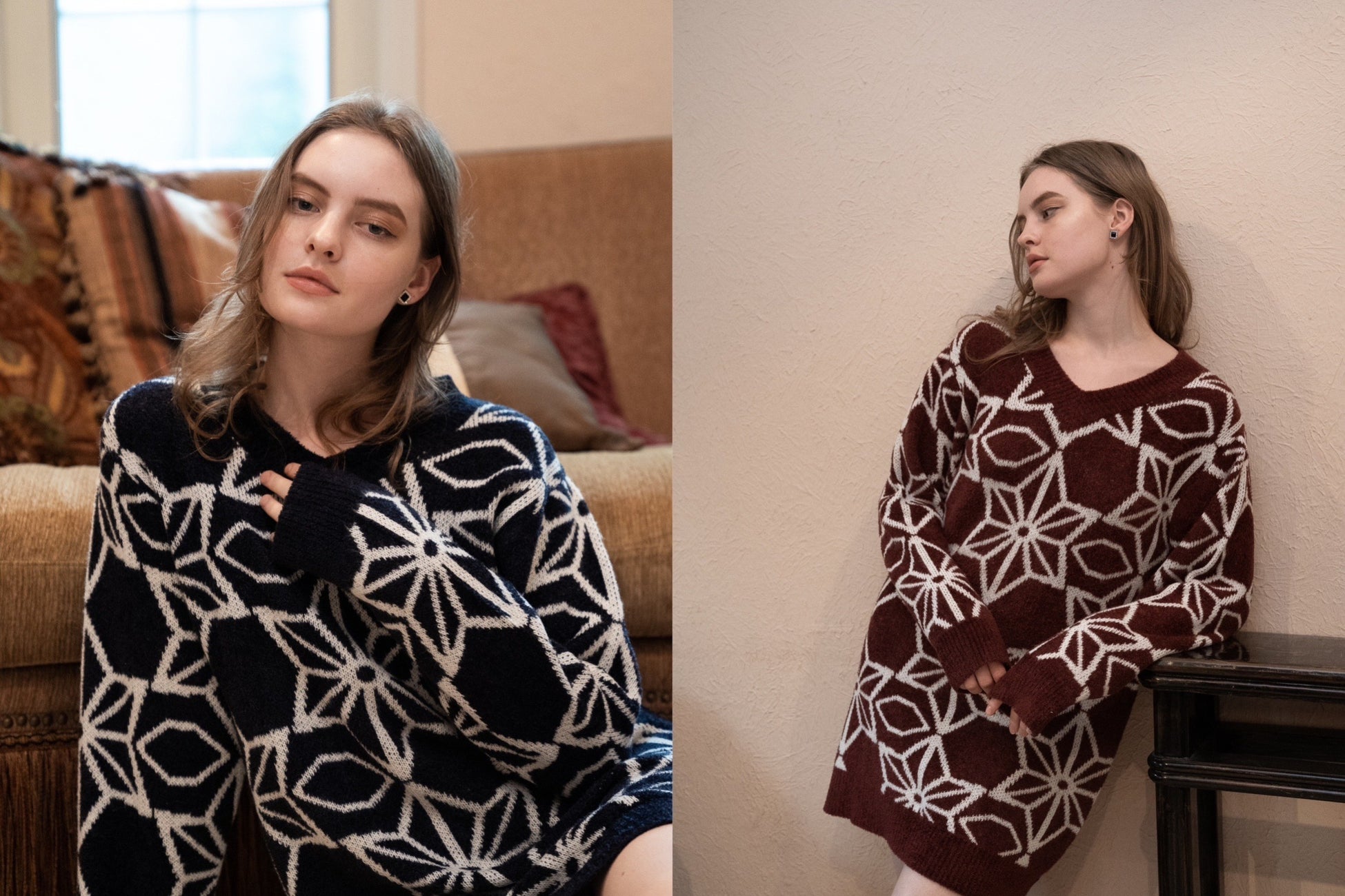 落ち着いたトーンの色味の中に入った大胆な和柄のデザインとVネックの首もとが重厚感のある上品な印象を作り出します。