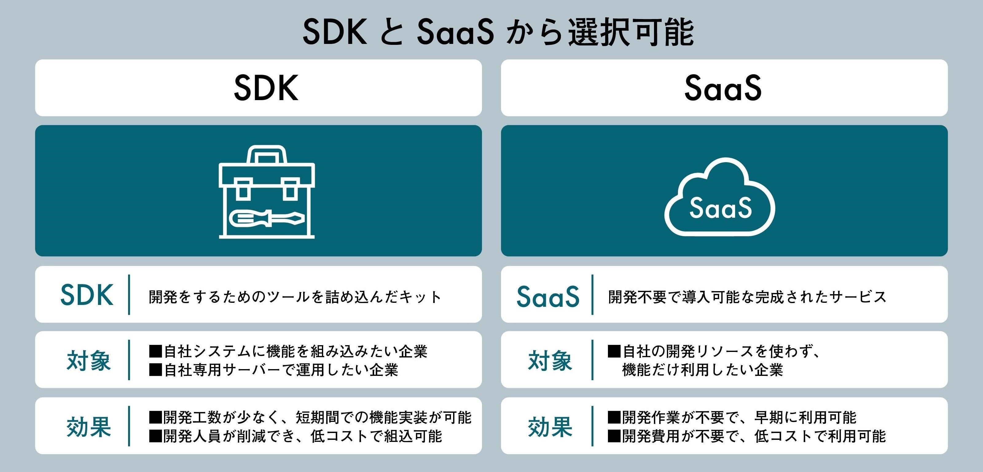 EV用テレマティクスサービス提供形態は、SDKとSaaSから選択が可能で、自社開発と比較して、どちらも「早期導入」と「スモールスタート」を実現します。