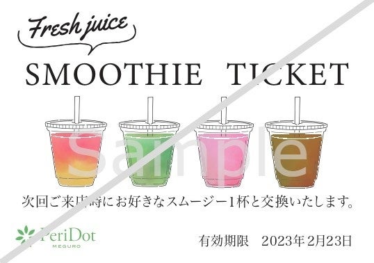 PeriDot meguro オープニングキャンペーンとして、税抜3,000以上お買い上げのお客様に、次回使えるオーガニックスムージー無料券をプレゼントいたします!期間は2023年2月28日となっておりますので、お早めのご来店をお勧めします。