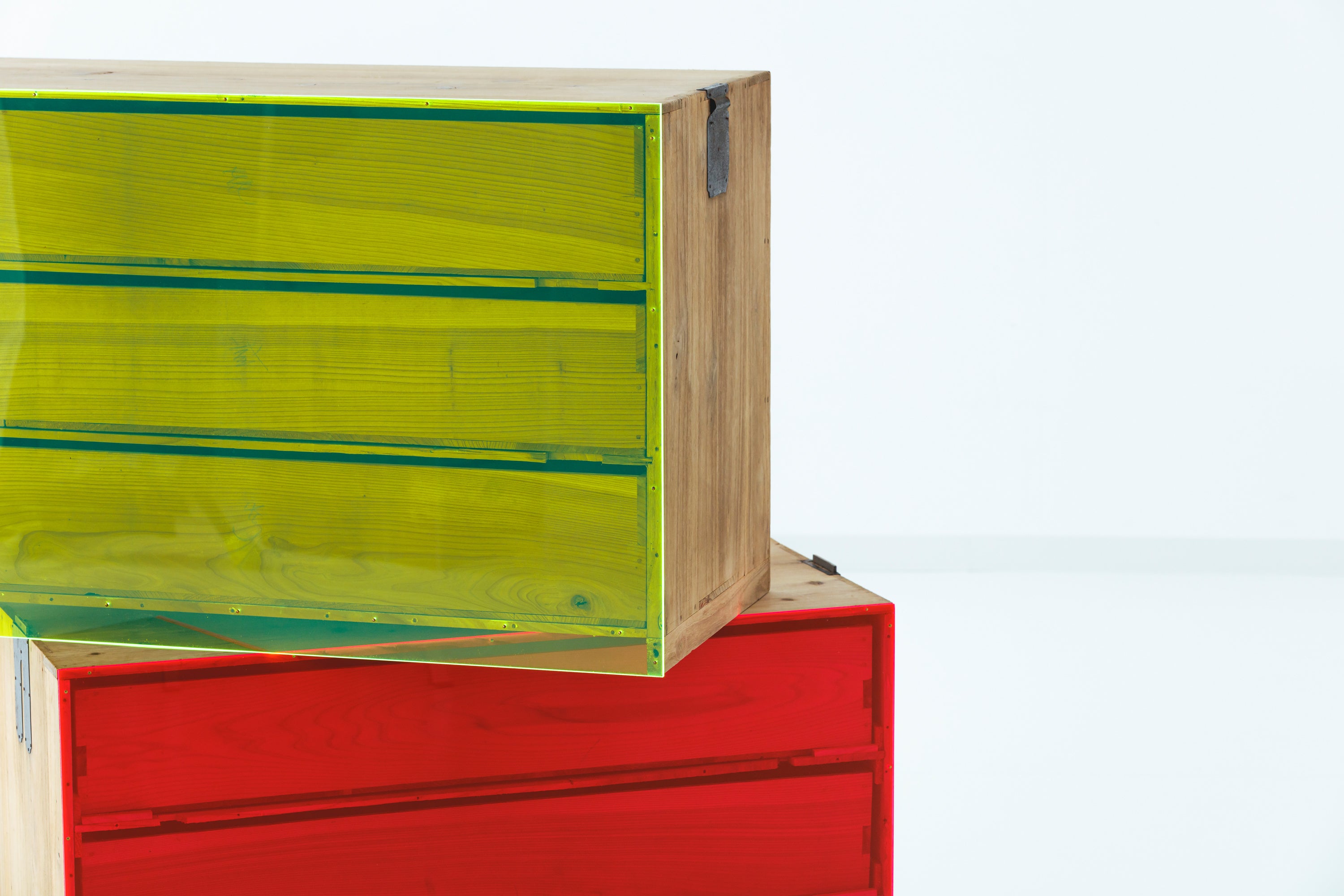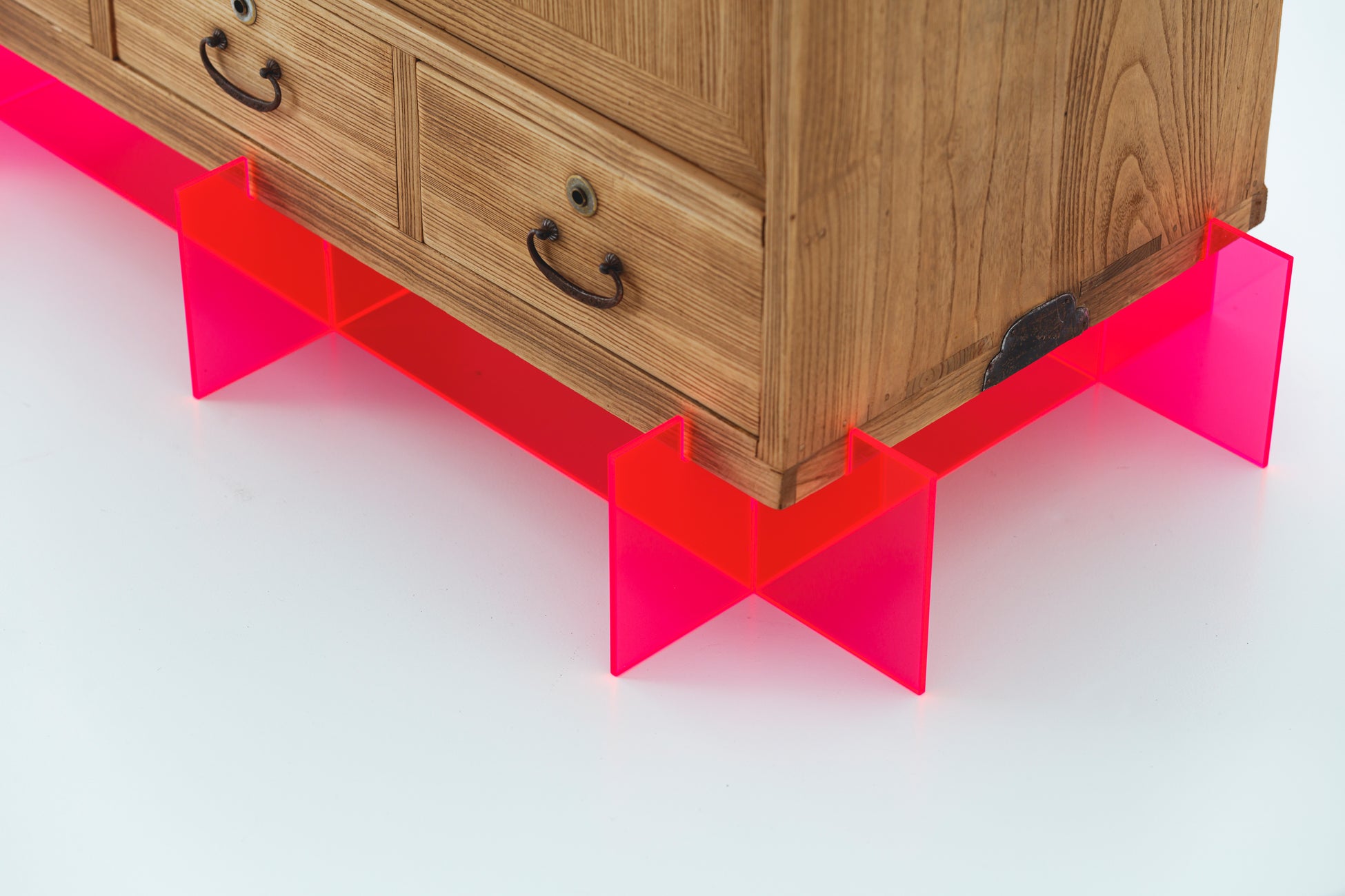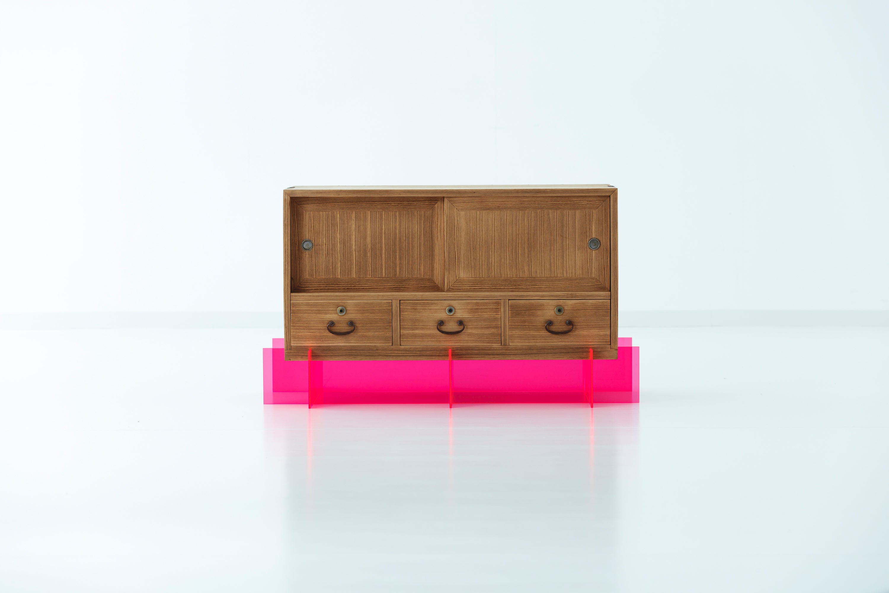 現代の素材の中から未来感を感じられる蛍光アクリルを古箪笥と組み合わせることで新旧を引き立て合うことを意図しました。