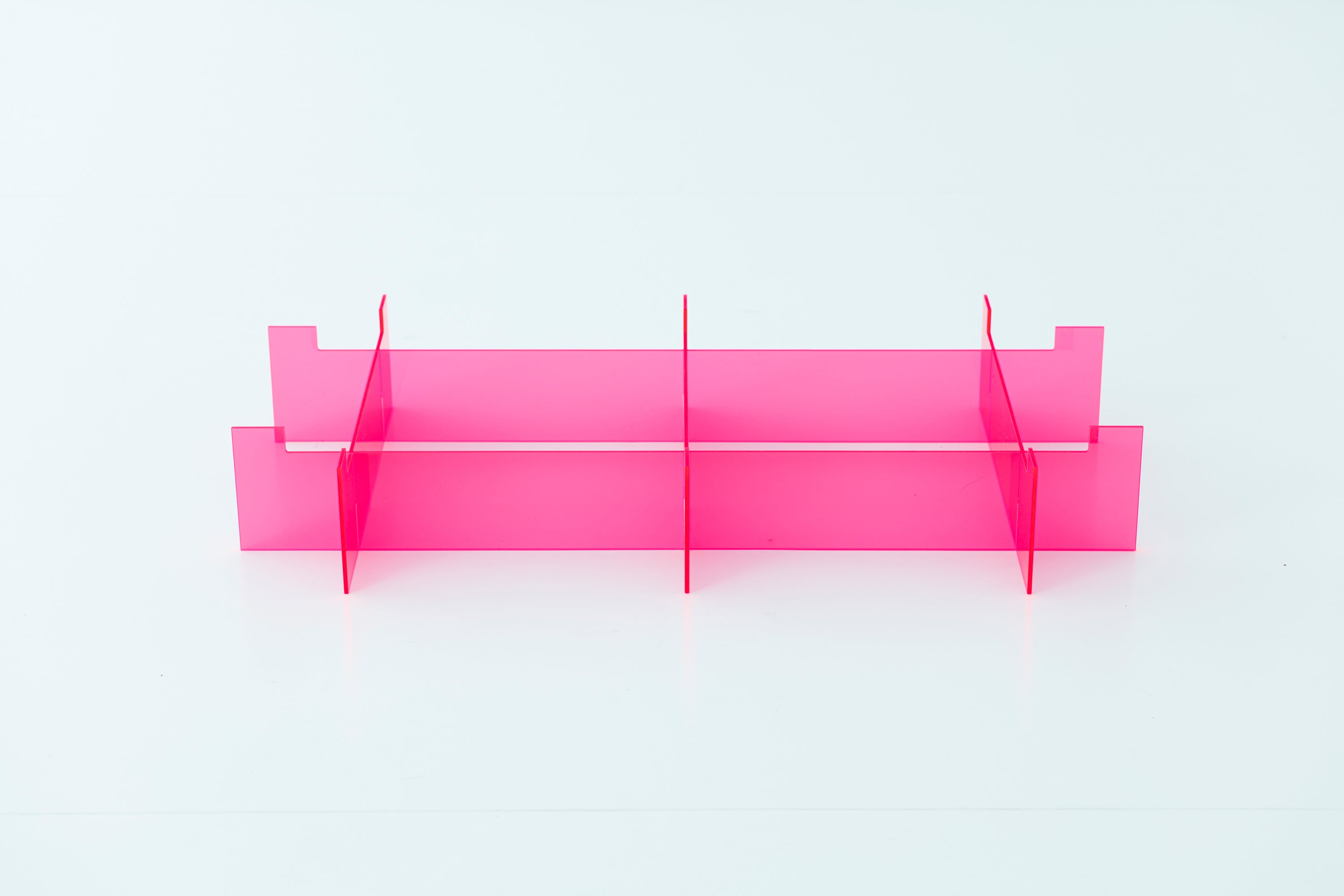 蛍光アクリルの台が、光を纏うことで透明感を持ち、箪笥を軽やかに感じさせます。