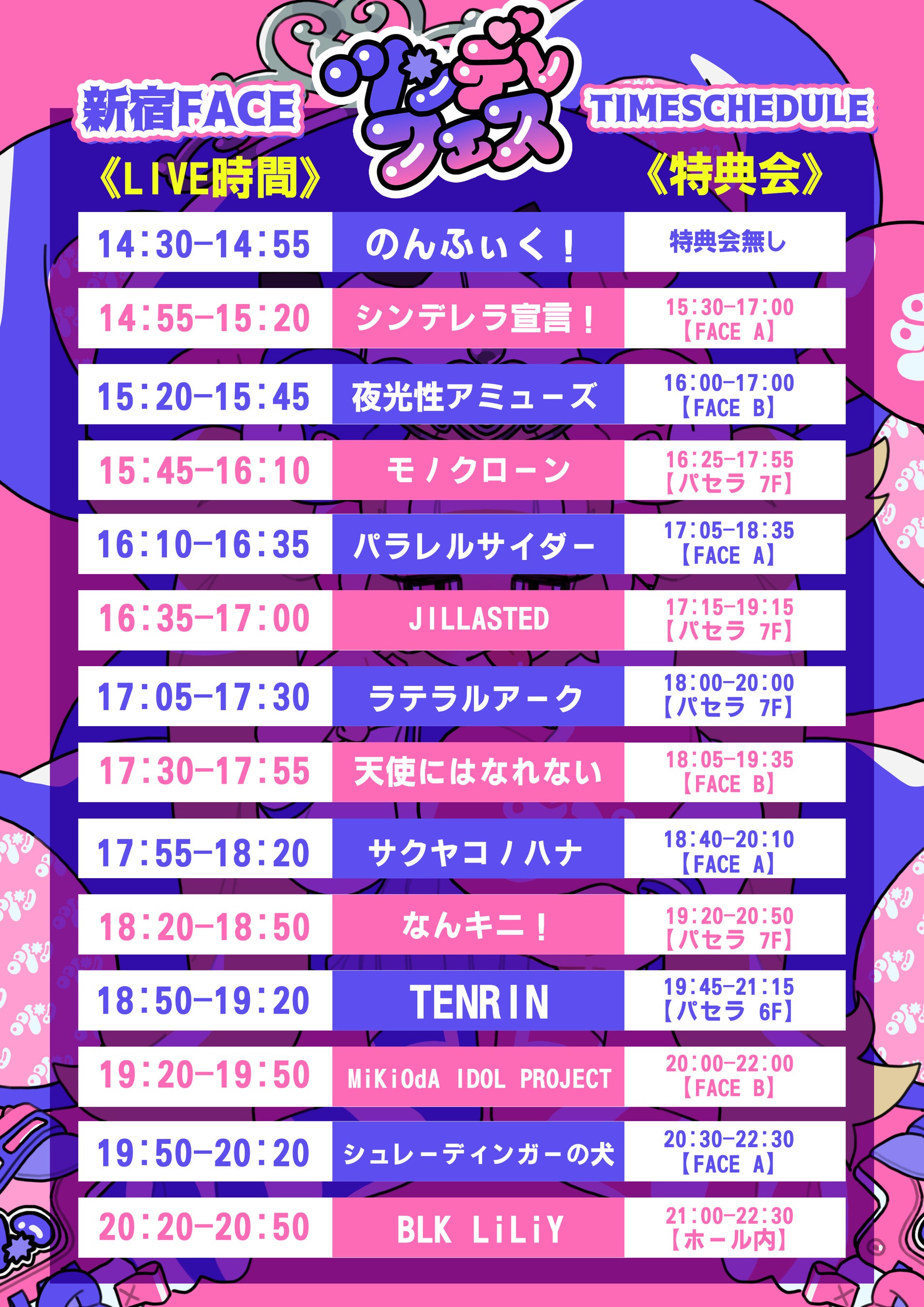公演名:ツンデレフェス Vol.1 〜新宿テディベアー パレード〜 supported by Amilige 出演:シンデレラ宣言!/ シュレーディンガーの犬 / ラテラルアーク / モノクローン / GILTY × GILTY / iLiFE! / 夜光性アミューズ / のんふぃく!/ twinpale / i-COL / TENRIN / パラレルサイダー / 天使にはなれない / BLK LiLiY / JILLASTED / MiKiOdA IDOL PROJECT / サクヤコノハナ / なんキニ!