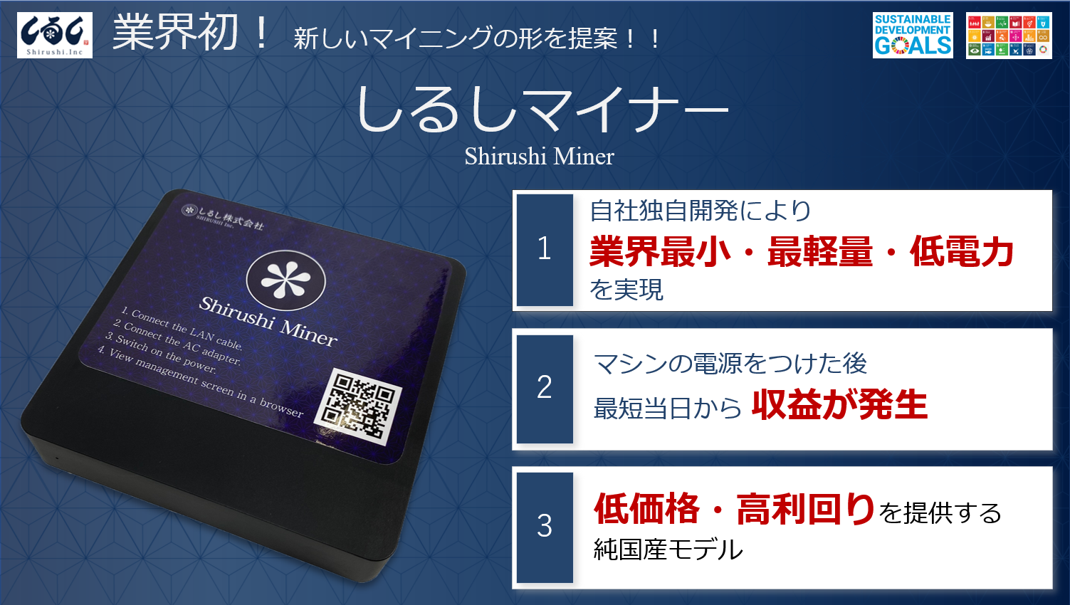 当社は、今までのマイニングマシンで課題となっていた電力消費を抑える為、独自開発により「しるしマイナー」における演算処理を極限までスリム化し、わずか8Wの消費電力でマイニングを行うように設計し、発熱を抑え環境に良い商品の開発に成功しました。これにより、電気代を抑えて運用が出来る為、低コストで収益が受け取れるモデルが実現しました。