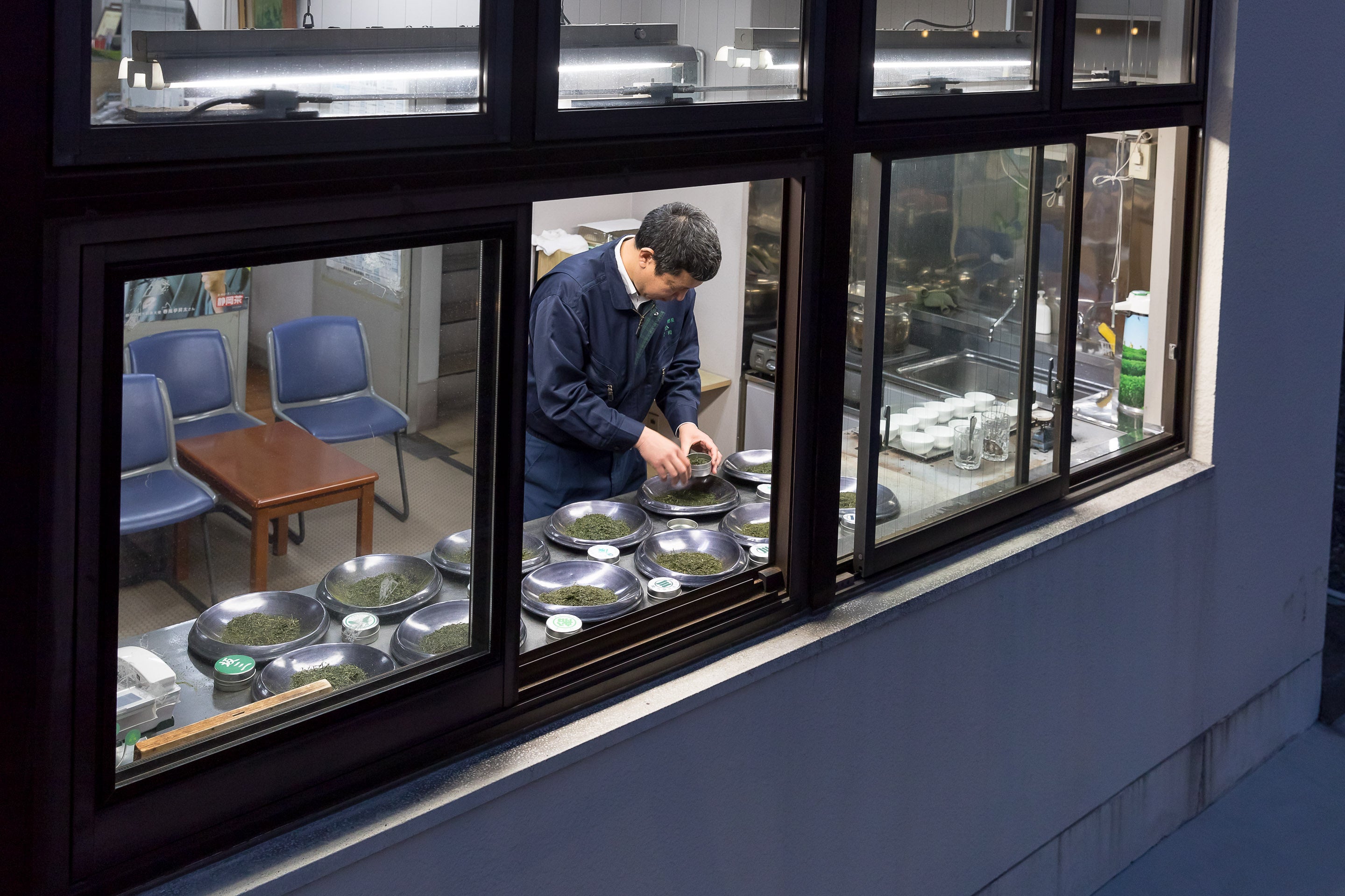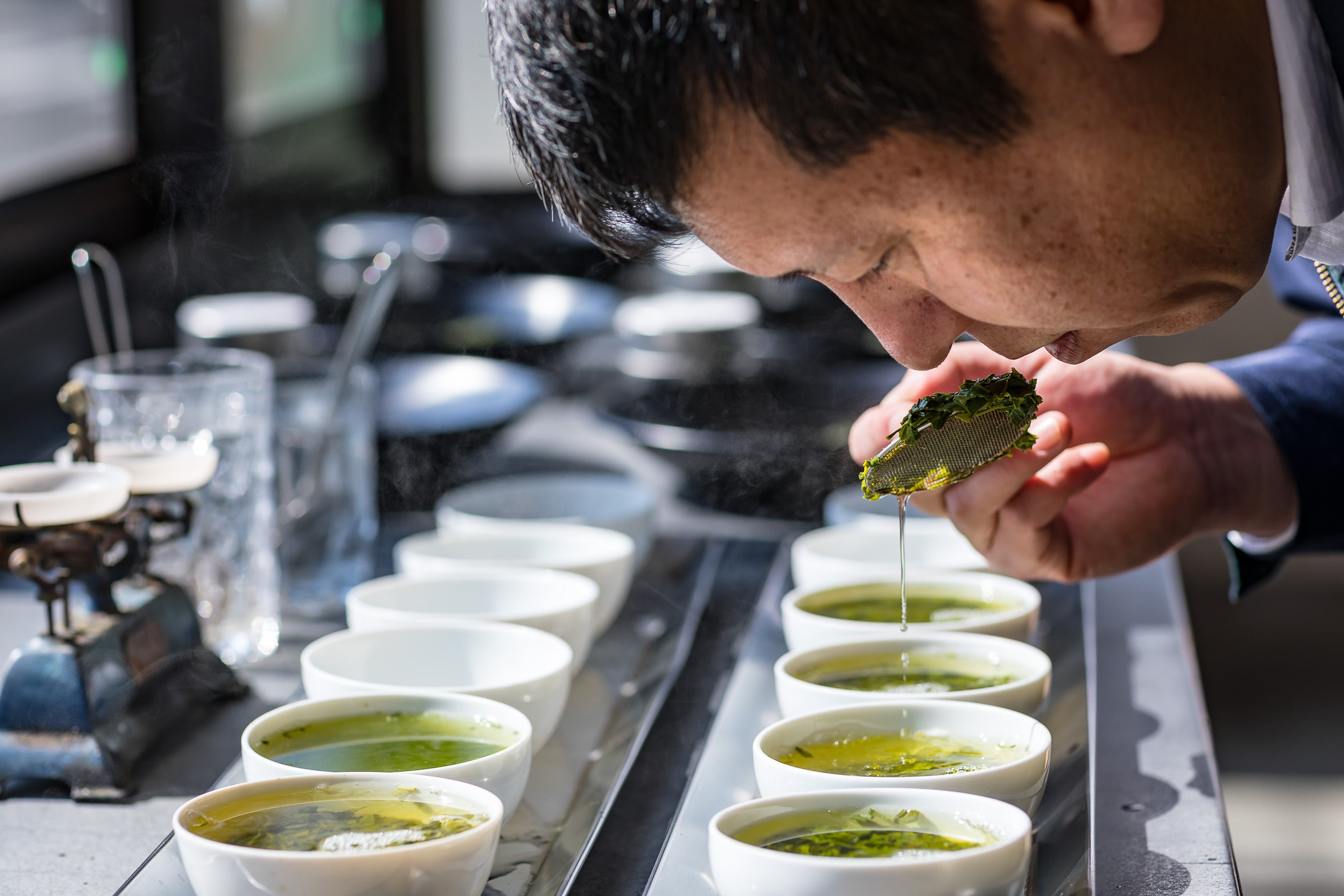 茶師は、培った技術でお茶の仕入れ、仕上げ、合組(ブレンド)を行います。なかでも茶師の業が光るのは、「合組」と呼ばれるブレンド技術です。茶葉によって、香りに特徴のあるもの、味にコクがあるもの、水色(すいしょく)が鮮やかなものなど実にさまざまな違いがあります。その茶葉の特徴を見出し、それぞれの長所が引き立つようバランスよく組み合わせることによって、単一のお茶にない味や香りを引き出します。これは、お茶の鑑別能力に優れた茶師にしかできません。