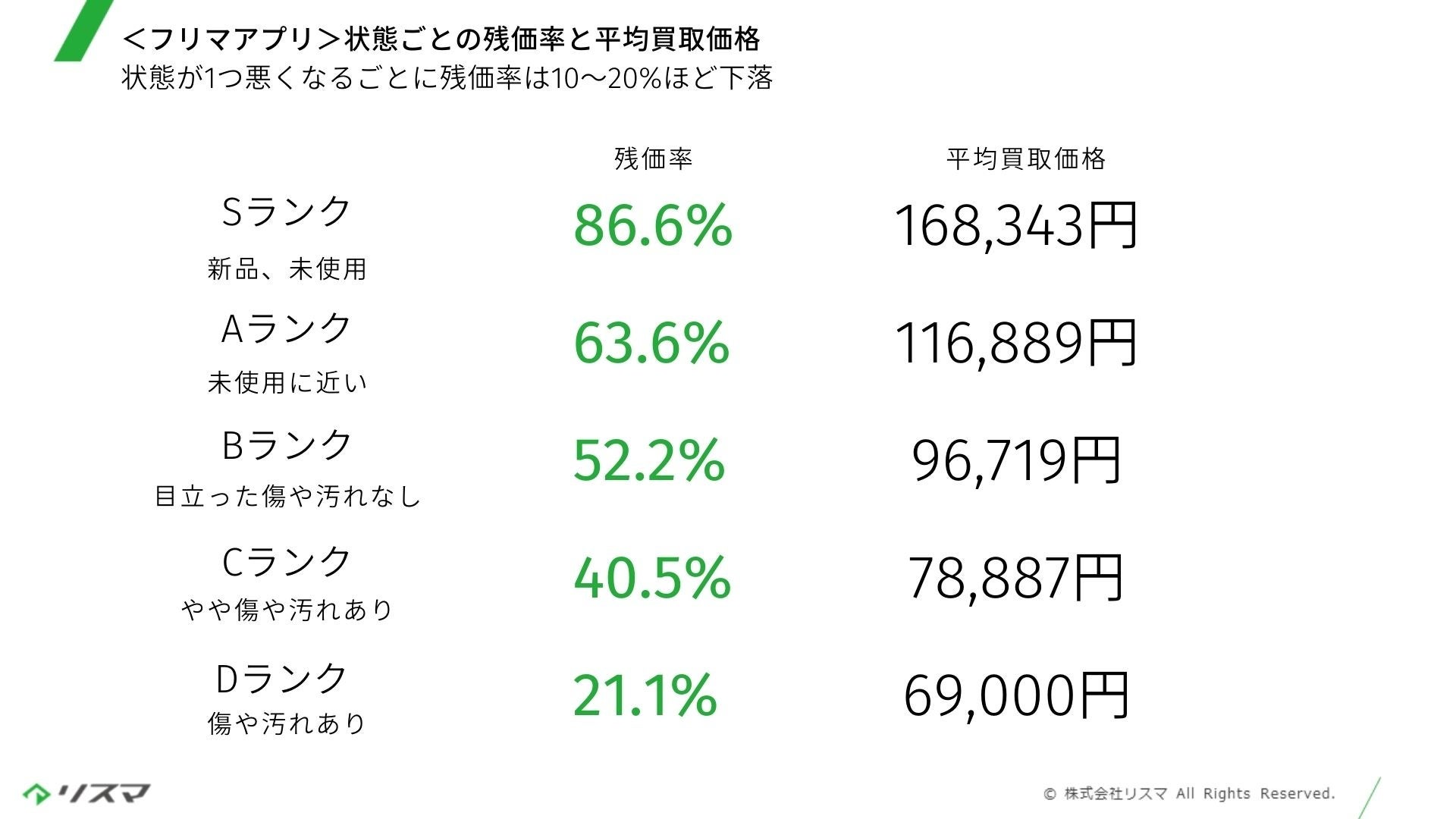 Cランクの取引が多い背景には、価格の手頃感があります。Aランクの平均フリマアプリ残価率(※3)は63.15%なのに対し、Cランクのフリマアプリ残価率は40.47%でした。つまり同じ中古品でも、Aランク品はおよそ4割引であるのに対し、Cランク品はおよそ6割引になります。