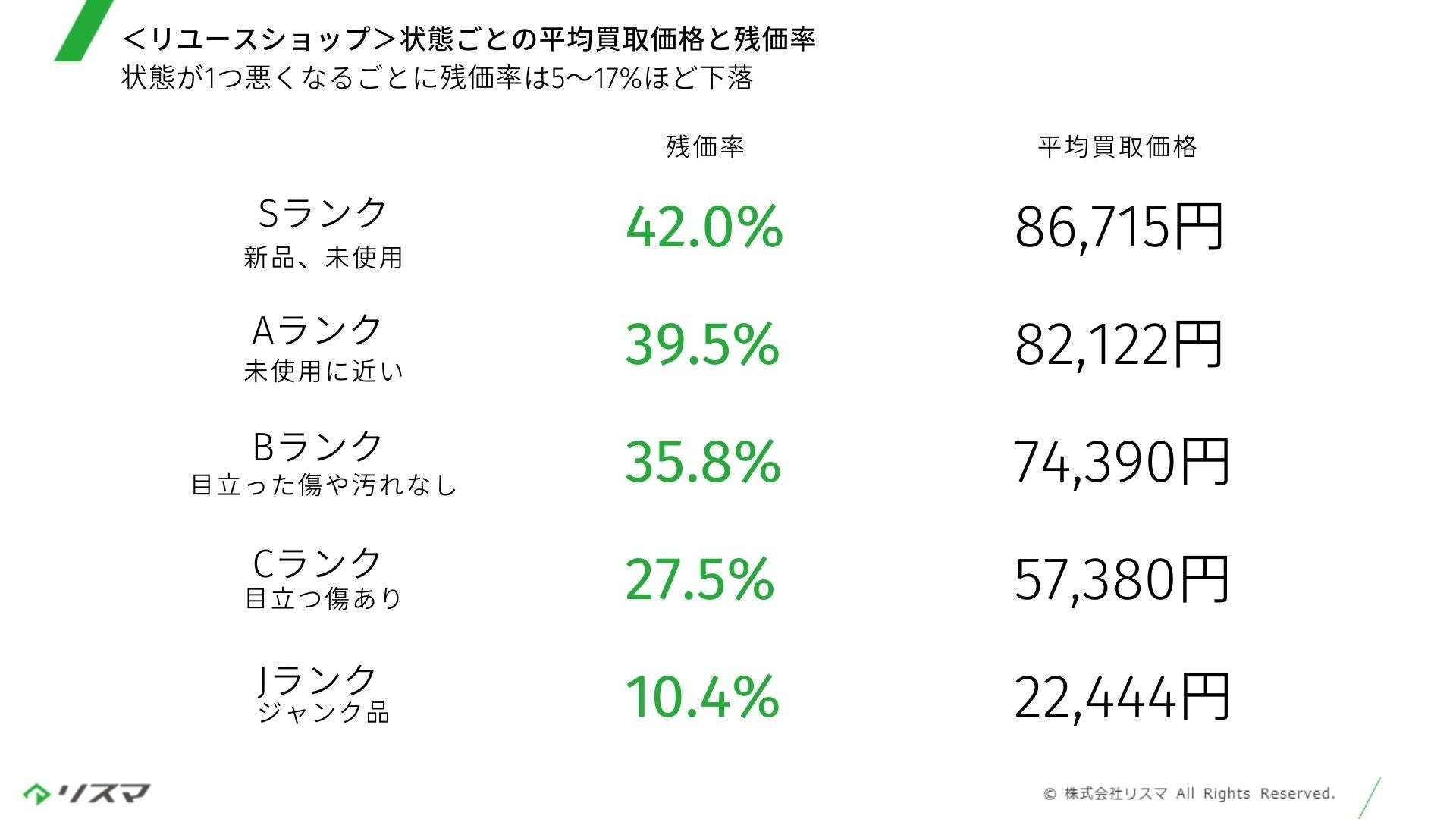 リユース店における各ランクごとの平均買取価格と残価率を調査したところ、Sランクで残価率41.95%となり、未使用に近いAランク(39.47%)、目立った傷のないBランク(35,77%)まで買取金額に大きな差が生まれないことがわかりました。
