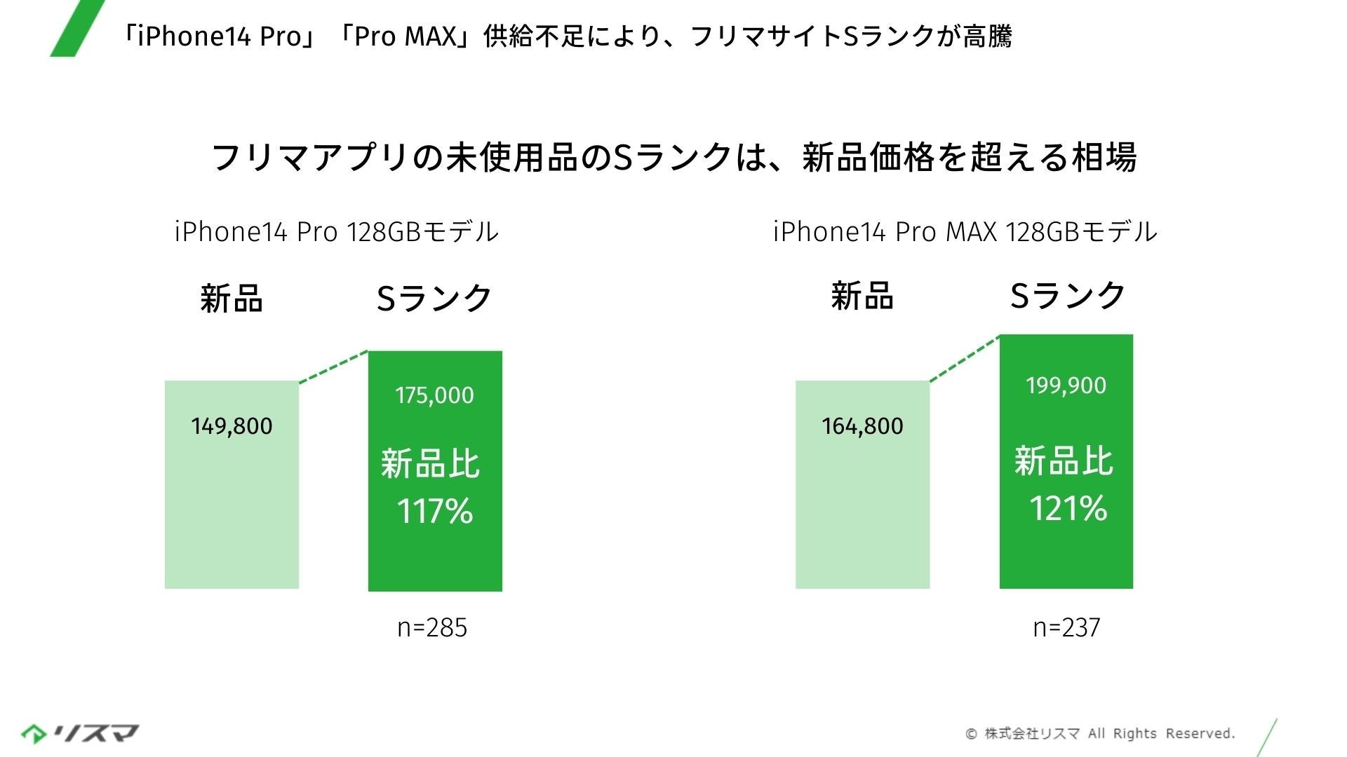 最新のiPhone 14 Proシリーズは「Dynamic Island」(ダイナミックアイランド)と呼ばれるインカメラと通知領域を兼ねたデザインや、常時表示ディスプレイなどの新機能が話題を呼ぶ一方で、昨年秋から冬にかけて品薄となり、入手まで時間がかかる場合がありました。こうした需給バランスを反映し、S・AランクのiPhone14 Proシリーズは定価を超える相場を記録したモデルが見られました。