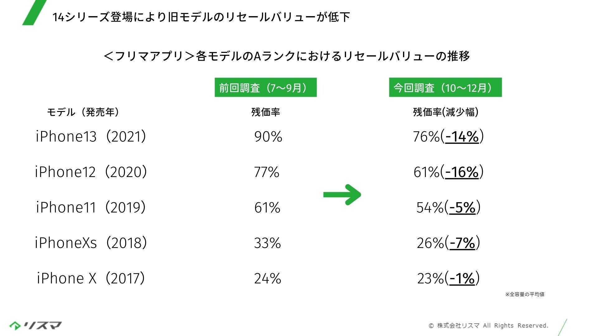 本調査においては2020年に発売されたiPhone12のリセールバリューがiPhone14発売前と比べて-16.51ポイント減の60.71%(全容量平均)でした。