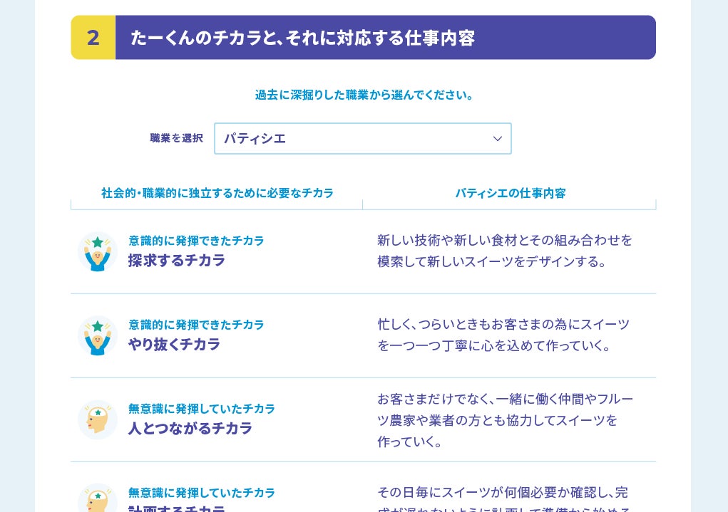 また、子どもが興味を持って深掘りをした各職業では、どのシチュエーションでどの能力が発揮できるのかをみることができます。