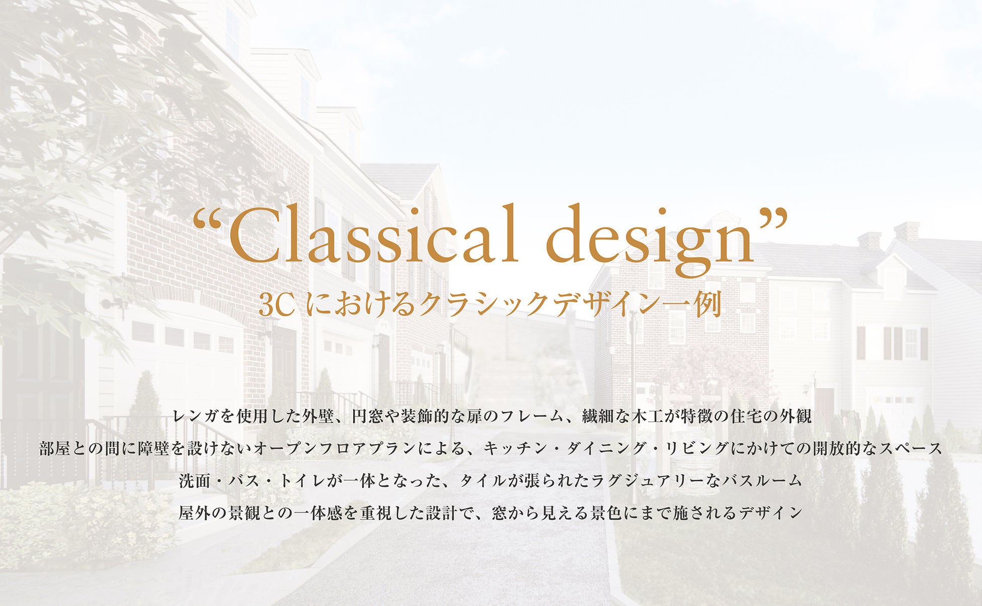 クラシックデザインとは、その地域の歴史や伝統を尊重し、時間の経過にも関わらずその価値や魅力が変わらないデザインです。このデザインを取り入れたアメリカの住宅地の需要は高く、長い歴史の中でその価値が証明されています。