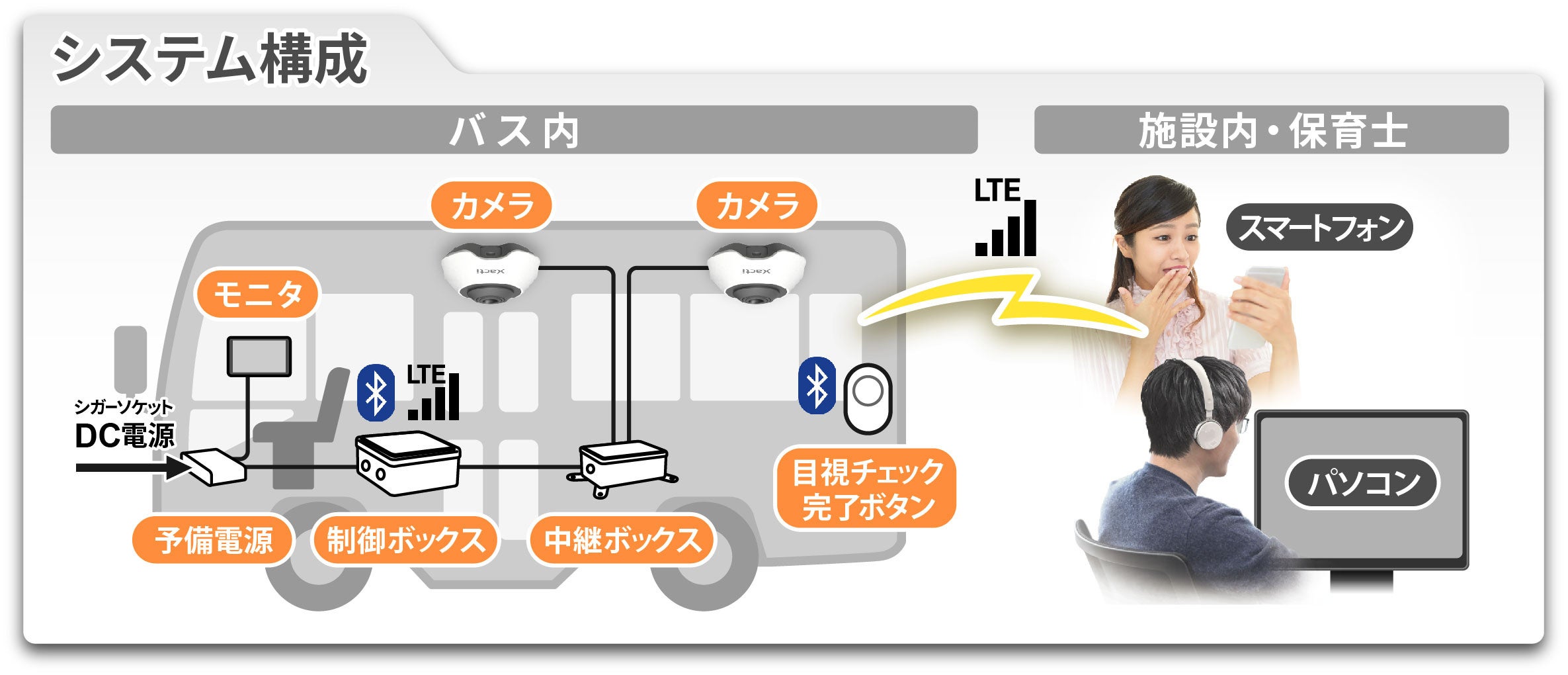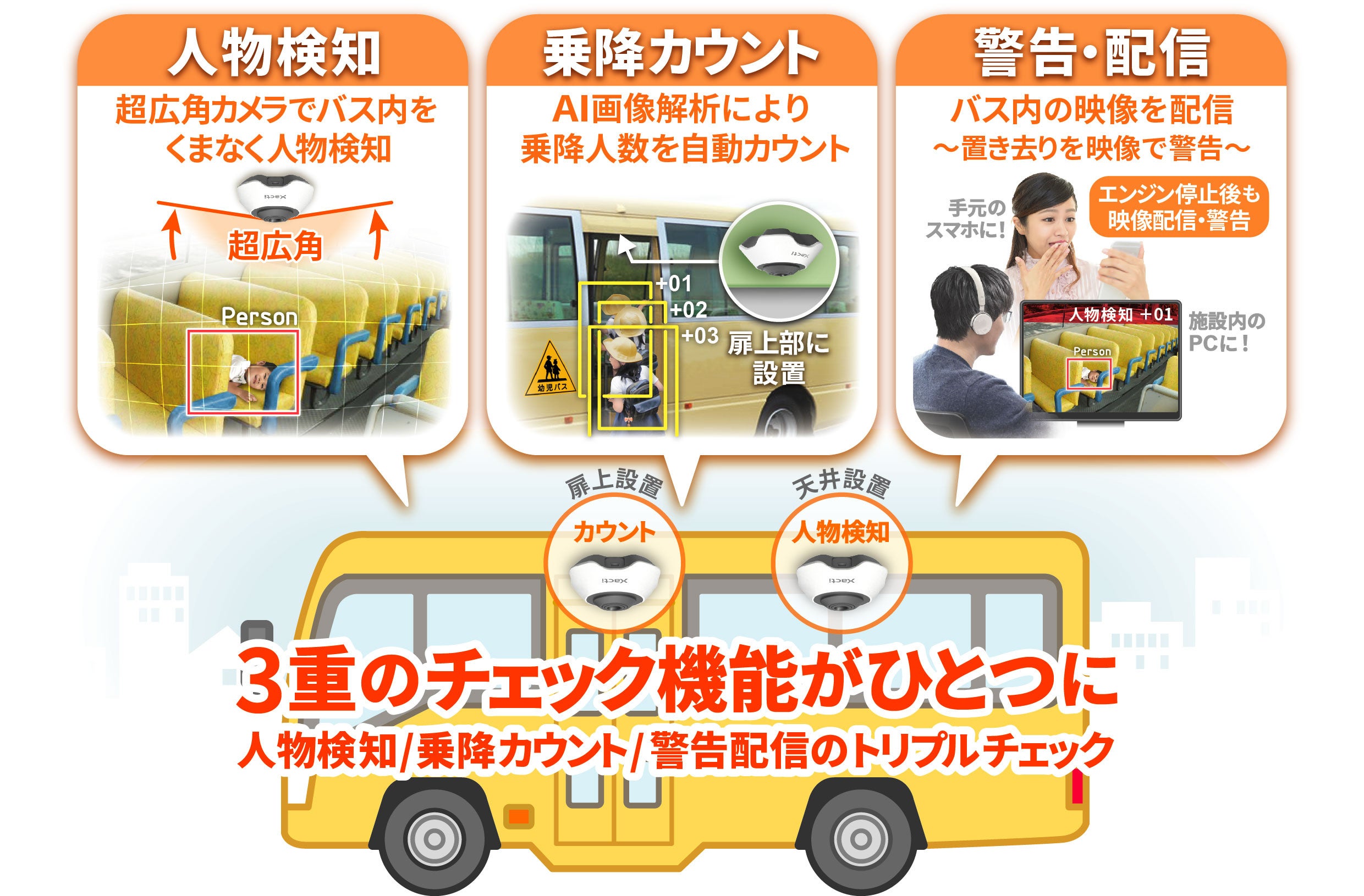 超広角360°全天周カメラを採用し、必要最小限のカメラ設置でバス内全体を広く撮影し、人物を検知。独自の画像処理エンジン搭載による高画質映像で、バス内を常時見守るもの。既存の送迎用バスに簡単に設置が可能。
