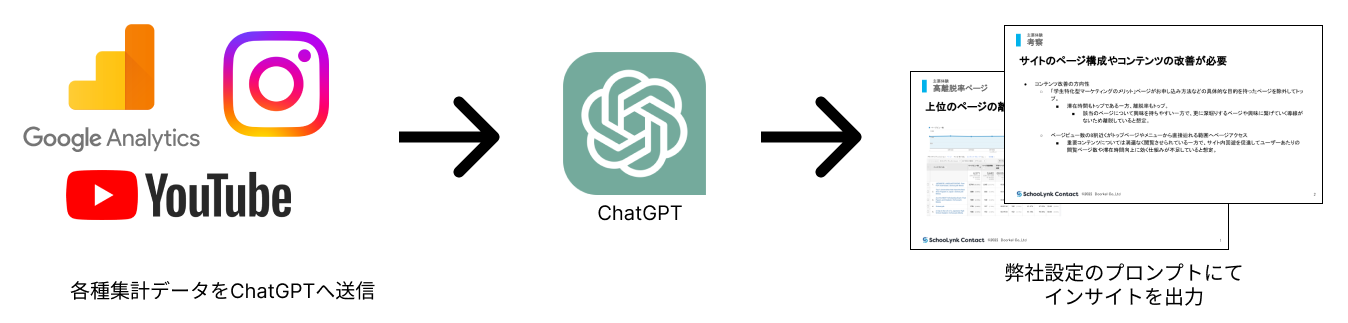 GoogleAnalyticsを使ったWebサイトのアクセス状況や各種SNSのフォロワーや投稿しているコンテンツを元に、Webマーケティングの現状分析や改善案などをChatGPTから提示します。学内でのレポーティングやマーケティング施策の改善に向けた具体的なアクションの洗い出しにご活用いただけます。