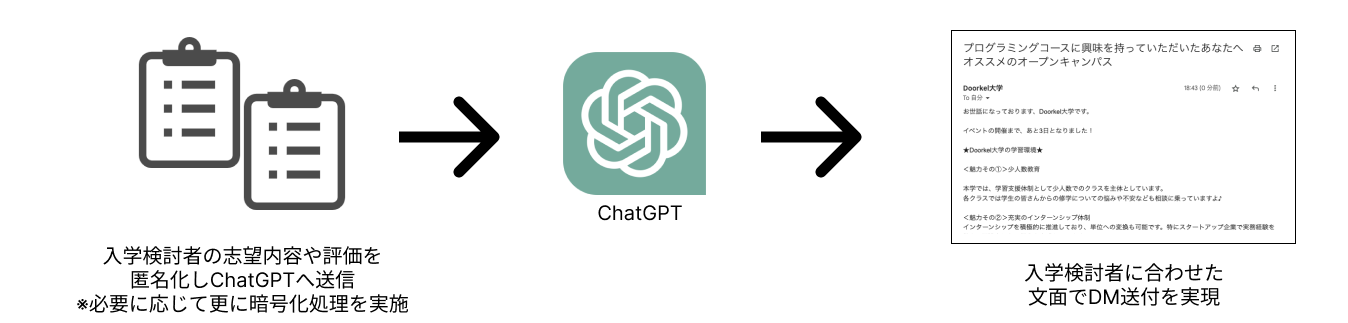 そこでDoorkelはChatGPTを活用し募集広報をはじめ、学校業務全体のDX推進を進めてまいります。