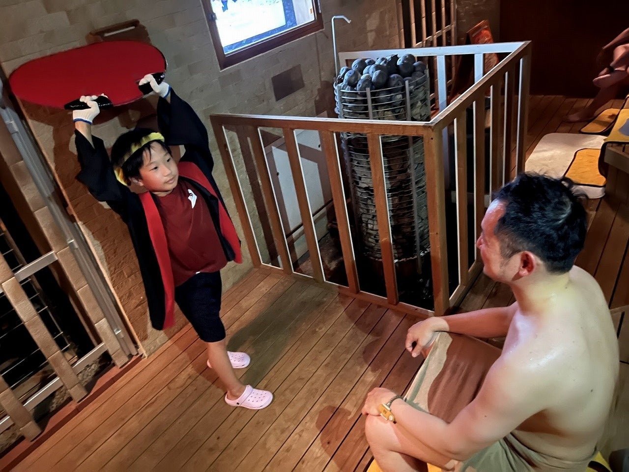 日頃から頑張って働くお父さんへの感謝の気持ちを込めて、ちびっこ熱波隊がお父さんに「熱波」をプレゼント。サウナに力をいれている「喜助の湯」ならではのイベントです。